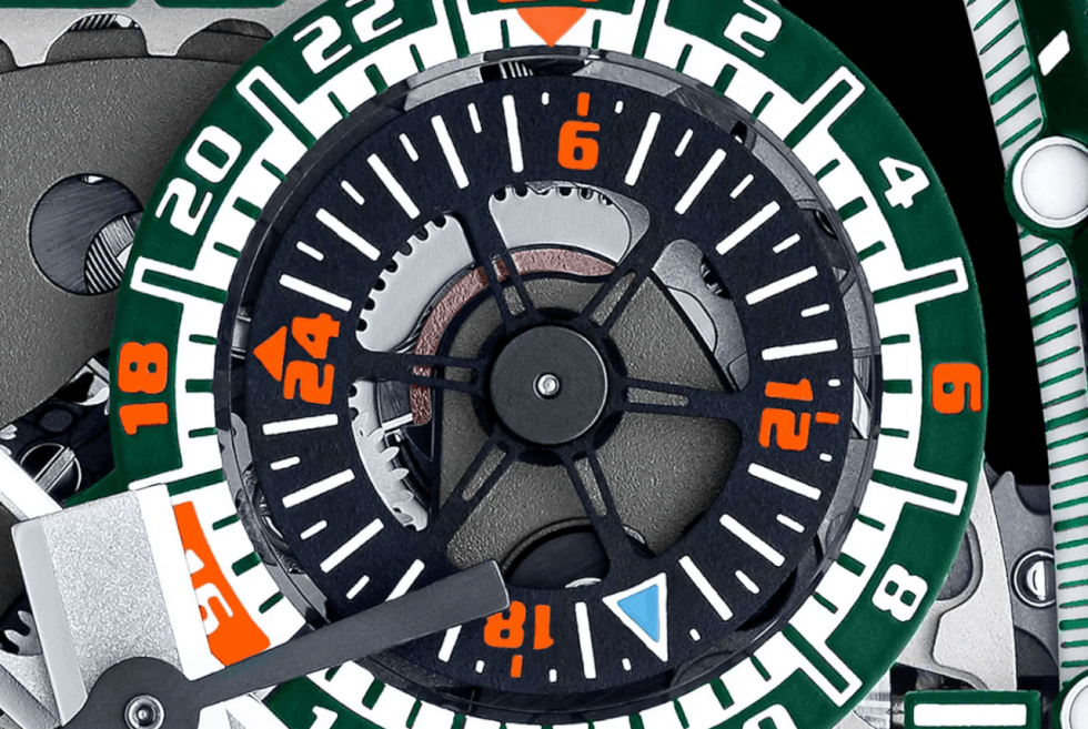 Another element that stands out is the bright orange accent on the crown. The chromatic theme continues on the openwork dial which also provides a peek at the skeletonized Calibre RMAS7 automatic movement. Richard Mille then points out that the baseplate and bridges are grade-5 titanium.