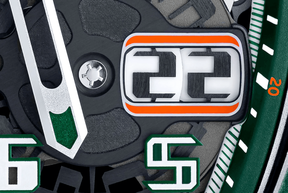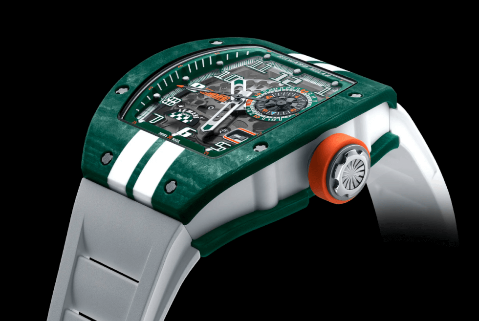 Richard Mille calls it the Automatic Le Mans Classic and the racing vibes are strong with its profile. The watchmaker’s ergonomic tonneau case is intact and is in a vibrant green/white colorway. The material of choice here is Quartz TPT.