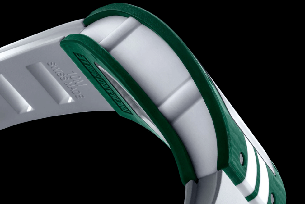The automated process creates mesmerizing patterns on the verdant surface. Meanwhile, there are two inlaid racing stripes in white for a sporty contrast on the front. The exhibition caseback of the RM 029 Automatic Le Mans Classic touts a similar style, but minus the two lines.