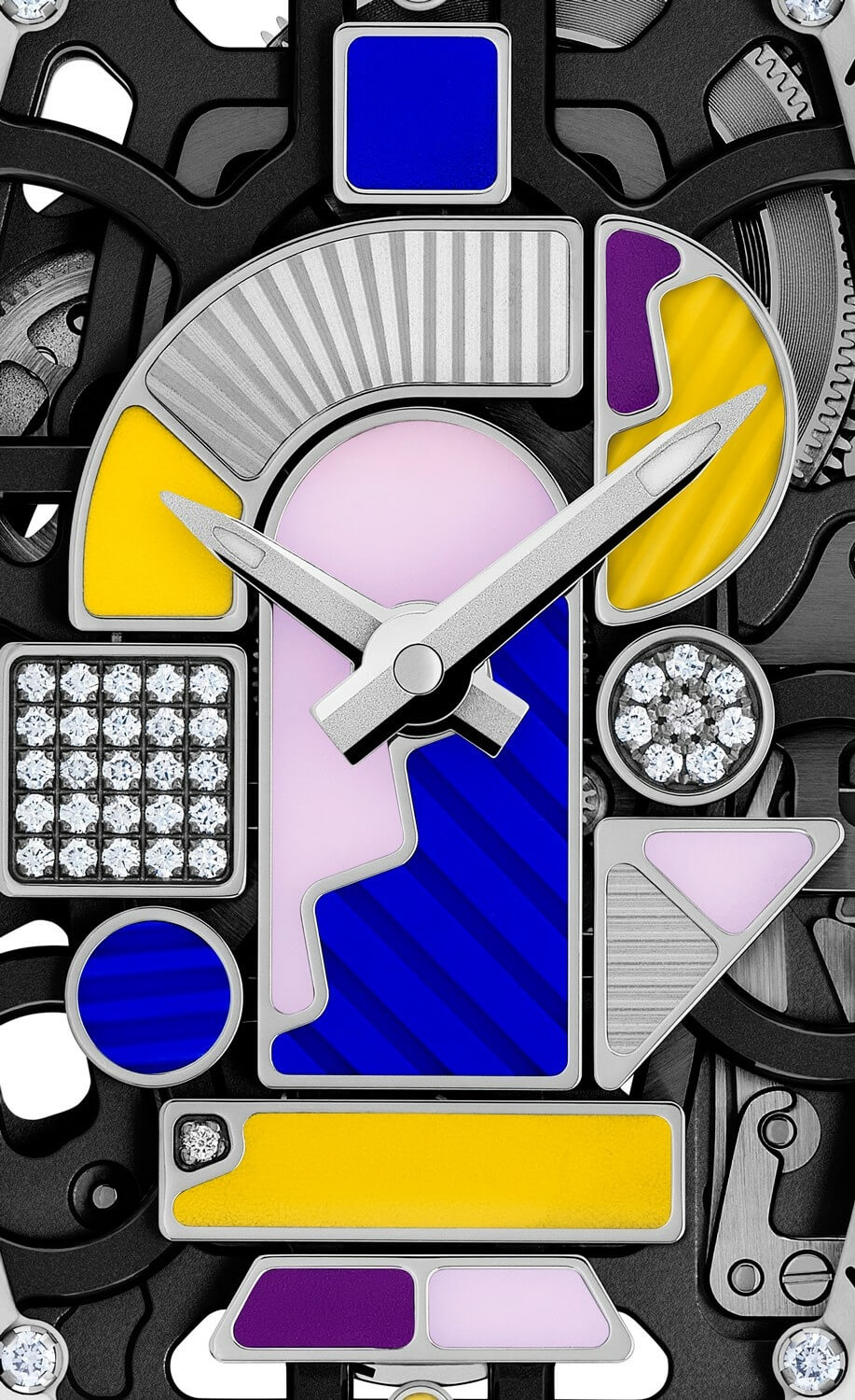 Meanwhile, the case middle is polished white gold with brushed support pillars. Richard Mille then goes the extra mile to set a variety of gemstones for additional contrast. These dazzling elements appear on the case, bezel, and skeleton dial. Each style touts a distinct arrangement of textures and materials that resemble contemporary art.