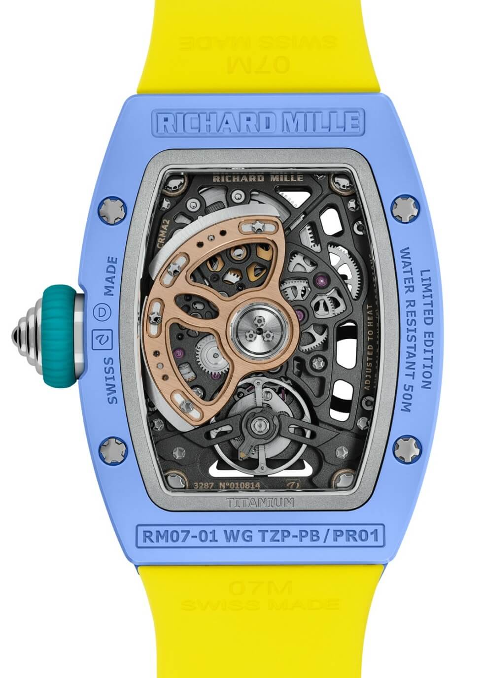 Last but not least, we have the intricate in-house CALIBRE CRMA2 with a 50-hour power reserve. The automatic movement features 25 jewels, a frequency of 28,800 vph (4 Hz), and measures 29.90 mm x 22.00 mm x 4.92 mm. Does the new RM 07-01 Coloured Ceramics collection resonate with you? If not, Richard Mille has more.