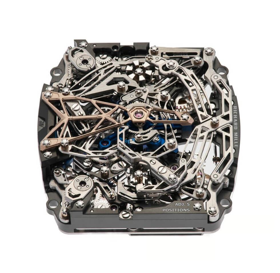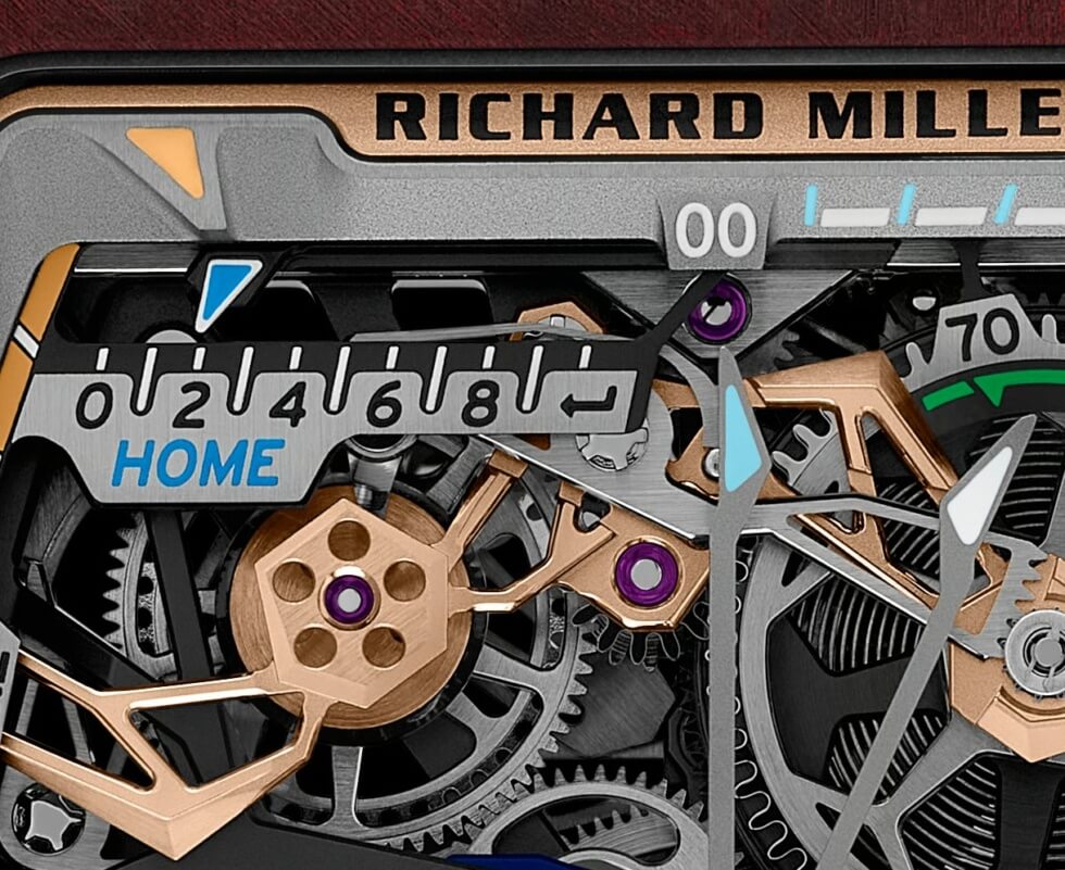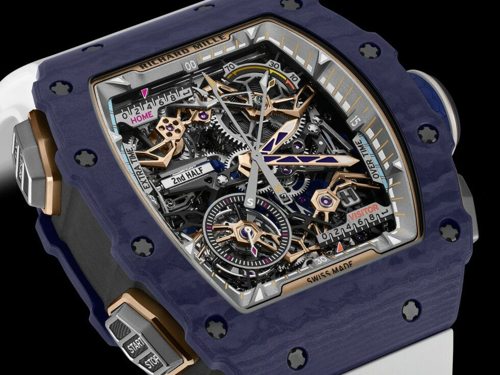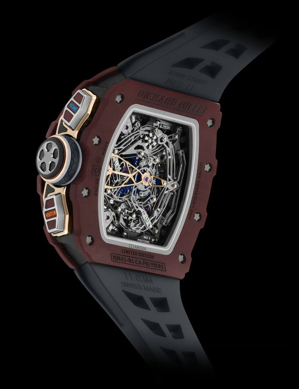 The in-house Calibre RM41-01 features “manual winding tourbillon movement with hours, minutes, seconds, flyback chronograph with central minutes and seconds, power-reserve, function and match-time indicators, mechanical goal counters.”