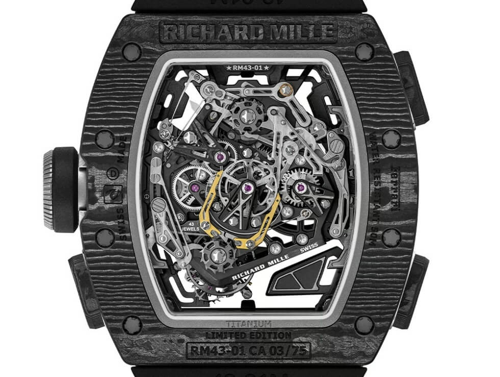 Since Richard Mille intimately understands just how fickle its clientele is, The RM 43-01 arrives in two versions. Fans of cutting-edge composites should pick the Carbon TPT option, while the micro-blasted titanium timepiece will have its fair share of fans. Only 75 examples are available for every style to give us an exclusive production run of 150.