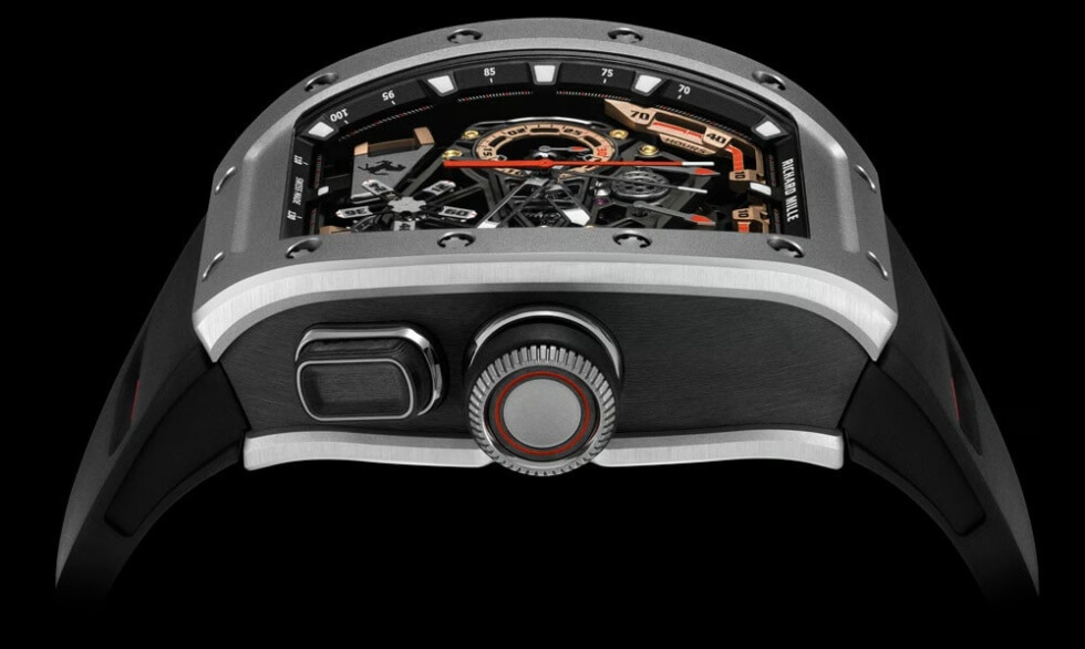 Operating all of its functions is an in-house RM43-01 hand-wound caliber. The 43-jewel manual movement has a frequency of 21,600 VPH (3 Hz) and an approximate power reserve of 70 hours. Also, viewable on the skeleton dial are a torque indicator, function indicator, and power reserve indicator. The RM 43-01 would make an excellent accessory for Ferrari owners or fans.