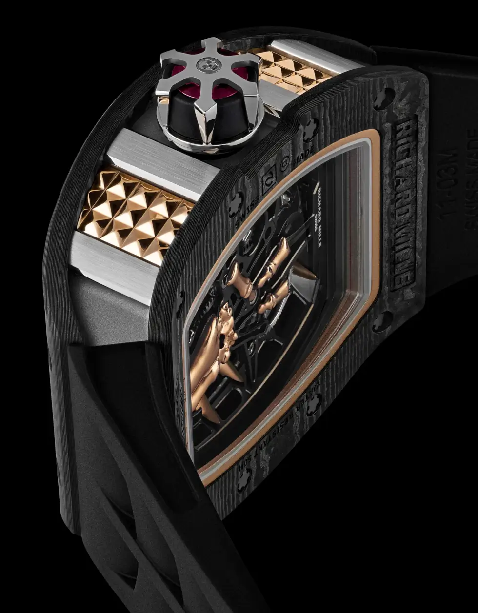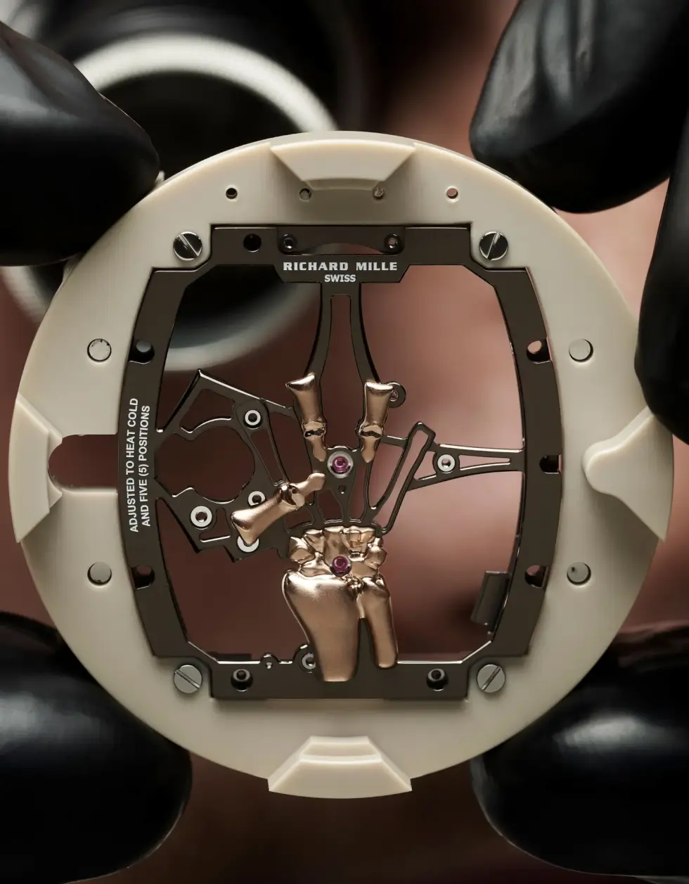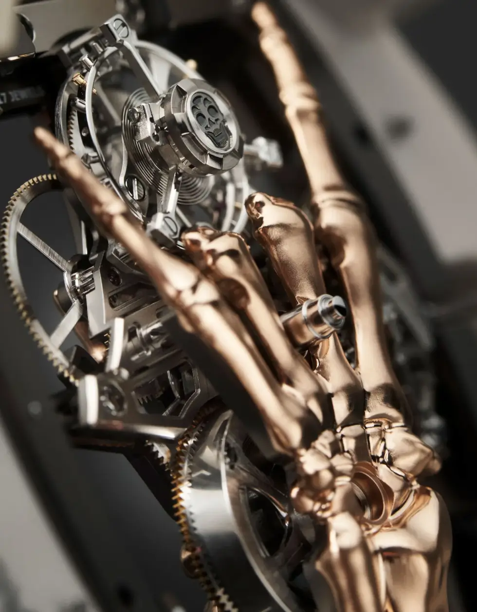It then opts for a combination of Carbon TPT for the bezel and case back, while the case band uses grade 5 titanium with 5N red gold inserts. Meanwhile, the gothic claw crown is likewise in grade 5 titanium. Framed by sapphire windows on both ends is the open-work dial with a 5N red gold skeleton hand in a devil horn gesture.