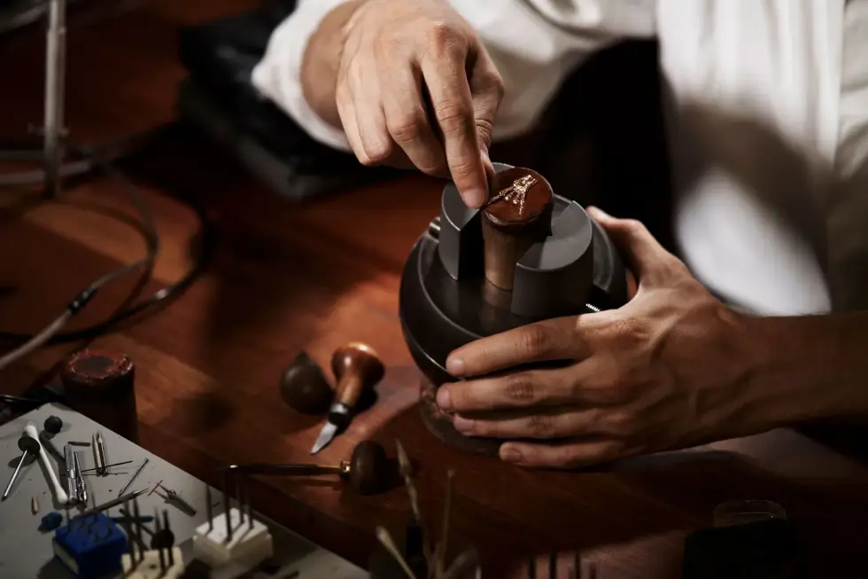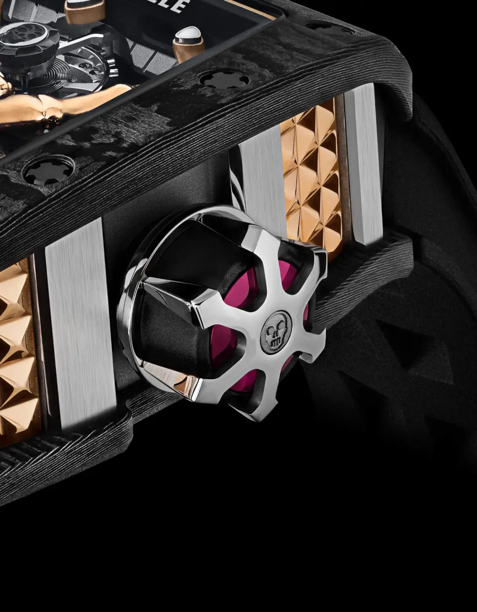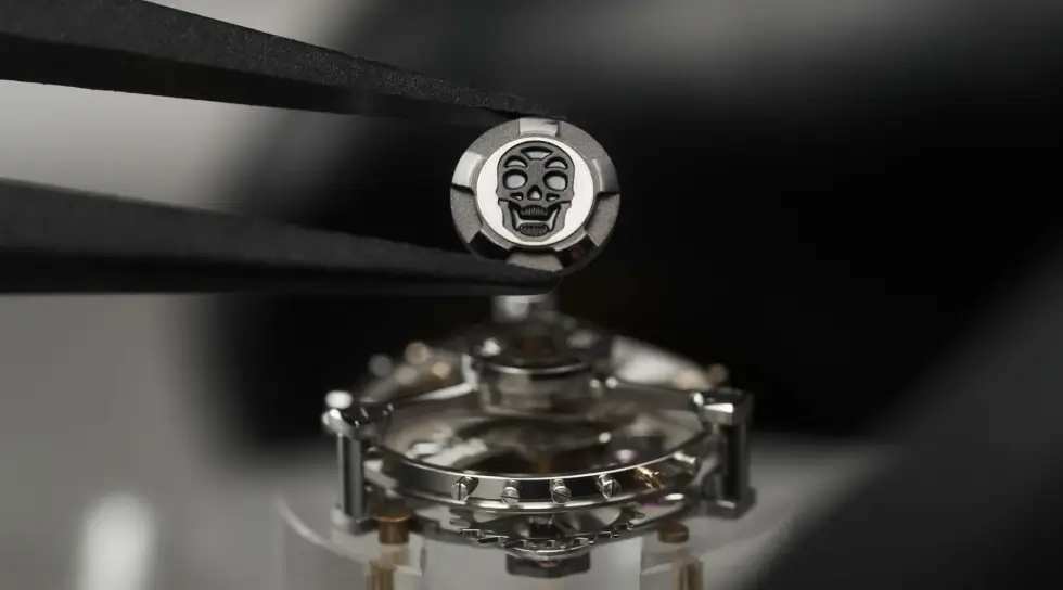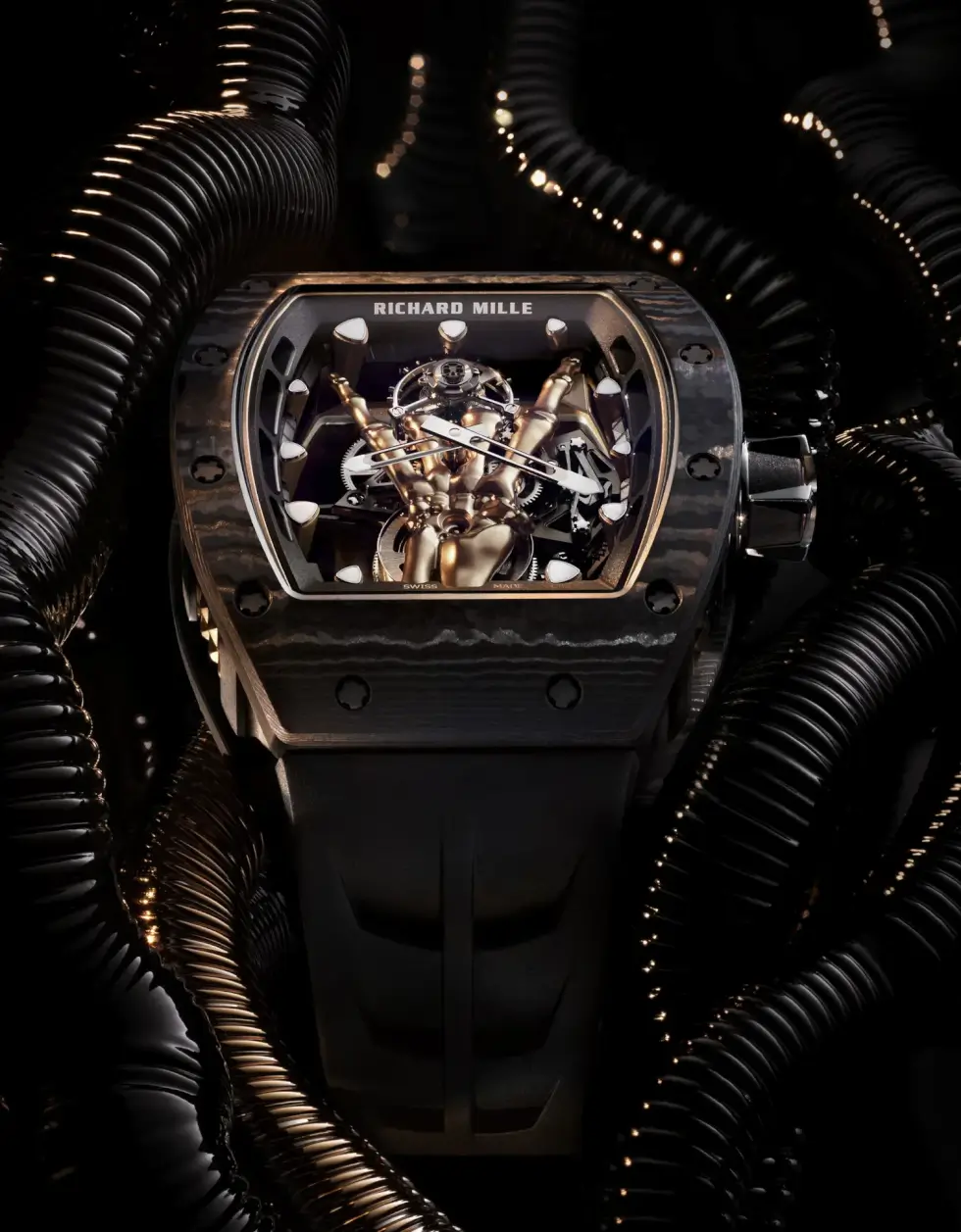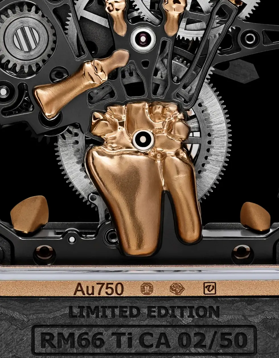 It then opts for a combination of Carbon TPT for the bezel and case back, while the case band uses grade 5 titanium with 5N red gold inserts. Meanwhile, the gothic claw crown is likewise in grade 5 titanium. Framed by sapphire windows on both ends is the open-work dial with a 5N red gold skeleton hand in a devil horn gesture.
