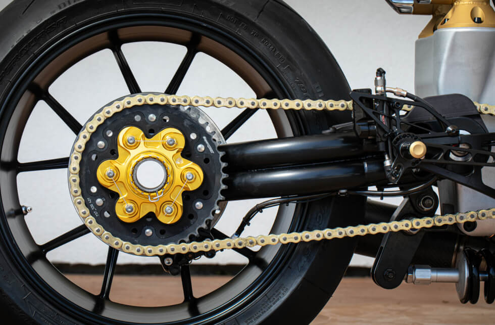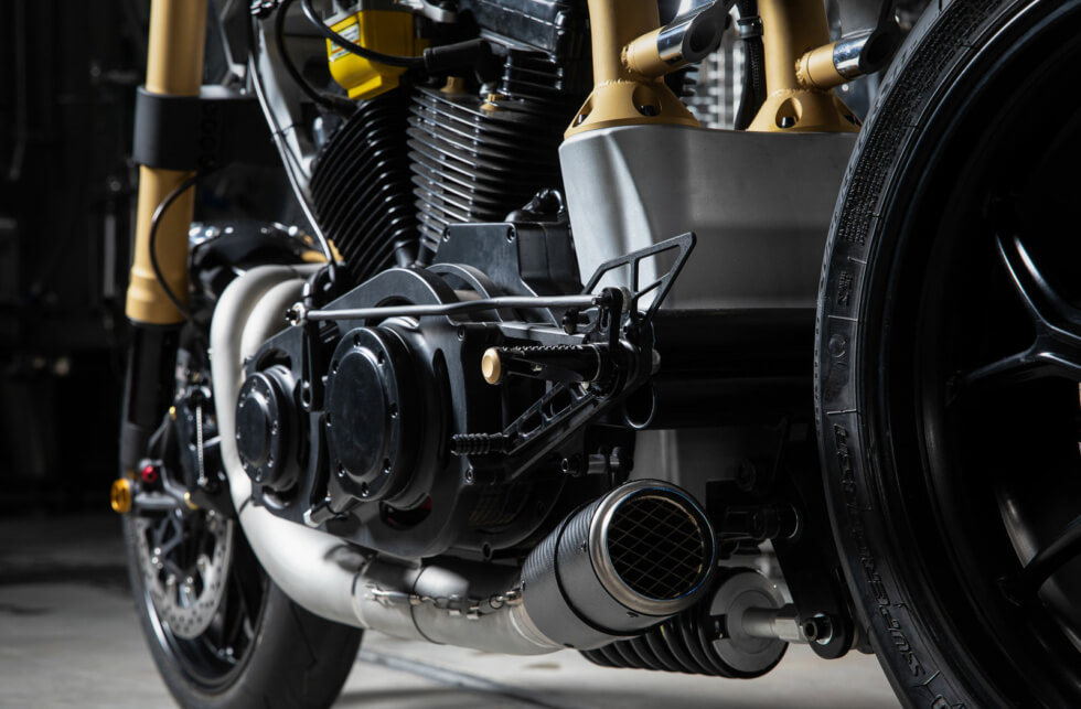 According to the team, the original plan was to fabricate a tubular aluminum Voxan frame and mount a 101-horsepower 1,203 cc V-Twin from a Buell S1 Lightning. The mill features 39 mm Keihin FCR carburetors. Meanwhile, the two-into-one underslung exhaust comes with an SC-Project carbon fiber muffler.