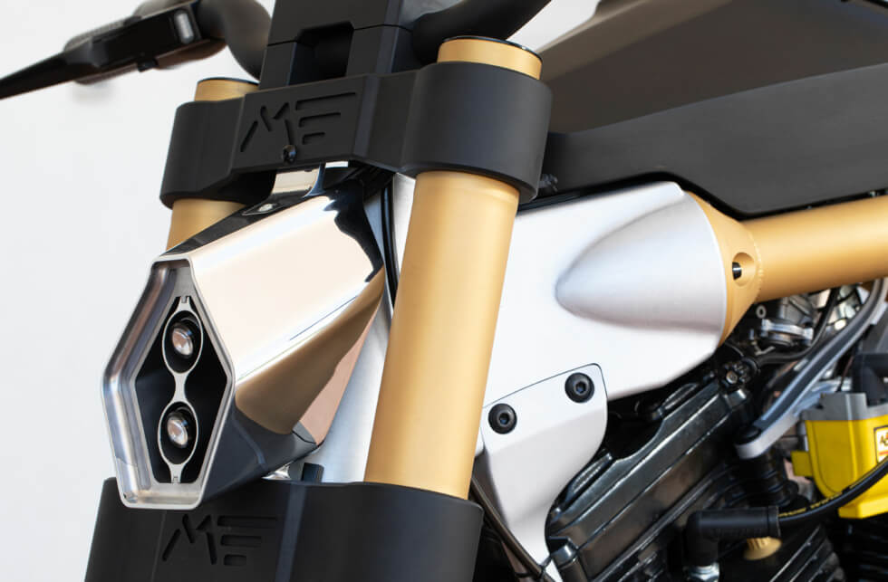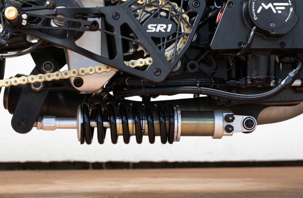 Its upturned tail section holds a custom SR1 saddle and looks ergonomic enough for long rides. A single-sided swing-arm flaunts a striking monoshock placement. The front holds an upside-down fork armed with a twin-disc Brembo brake unit sourced from a Ducati 1198. There’s also an angular headlight assembly. Finally, the S1 MMC sits on a pair of black Marchesini rim shod in racing slicks.