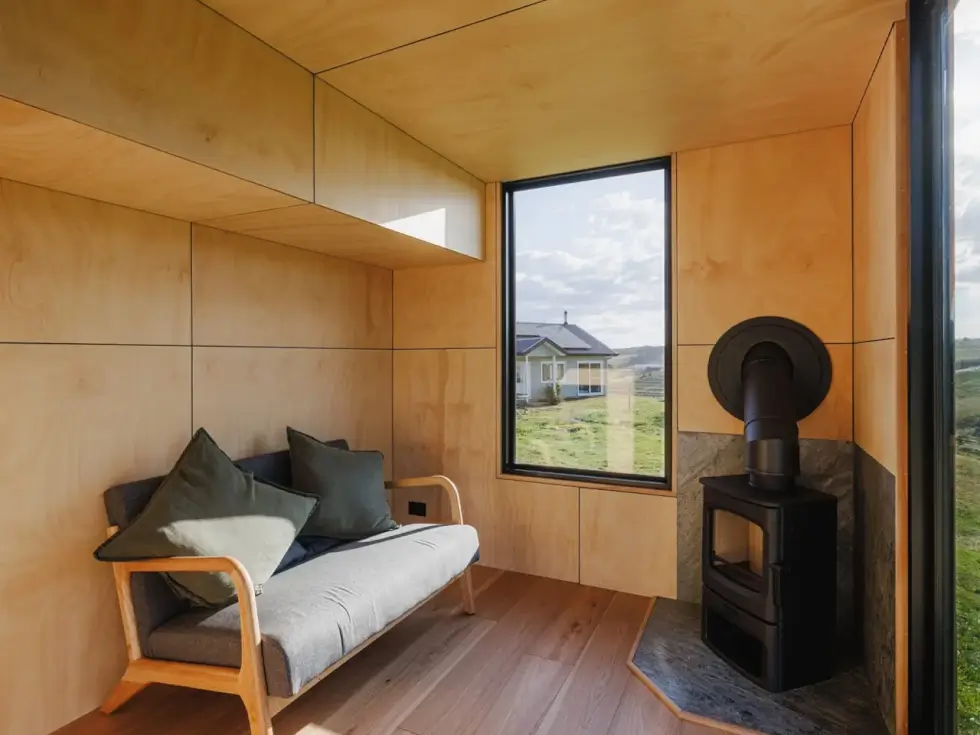 As with other tiny houses, the Marrangaroo opens directly to a cozy living room equipped with a sofa and a wood-burning stove. The highlight of the house is the kitchen, which has modern appliances for cooking. It has a full-size refrigerator, an oven, a sink, a propane-powered four-burner stove, and even a dishwasher.