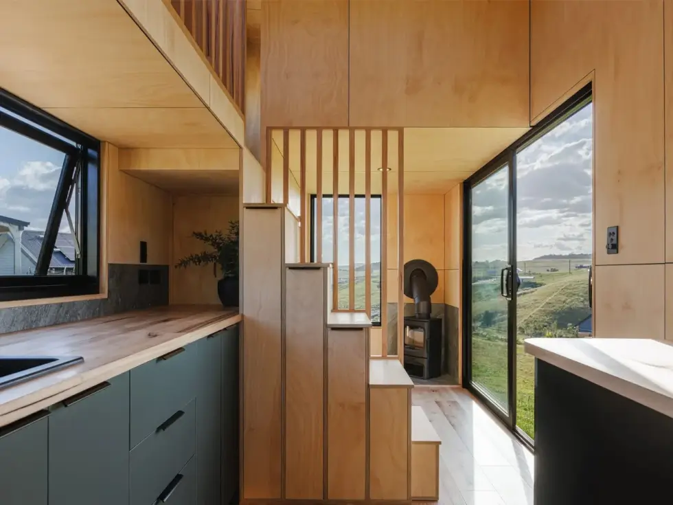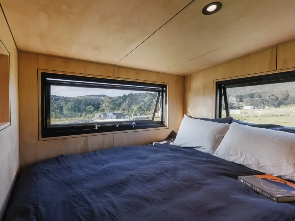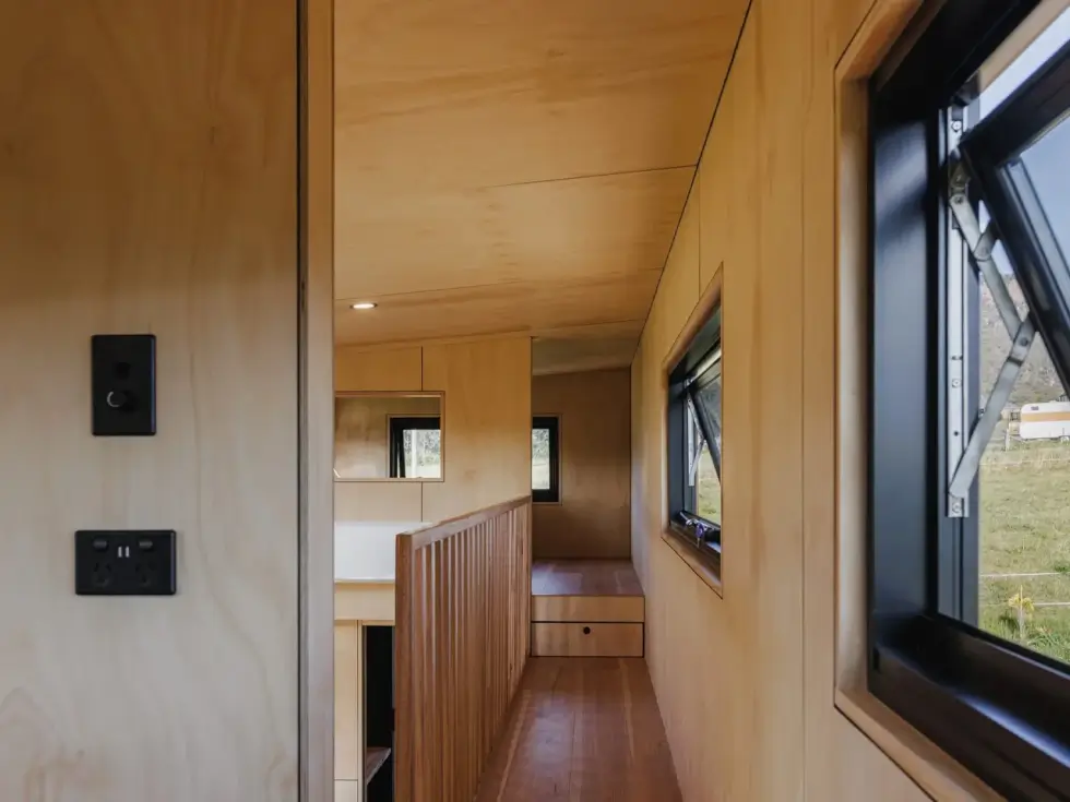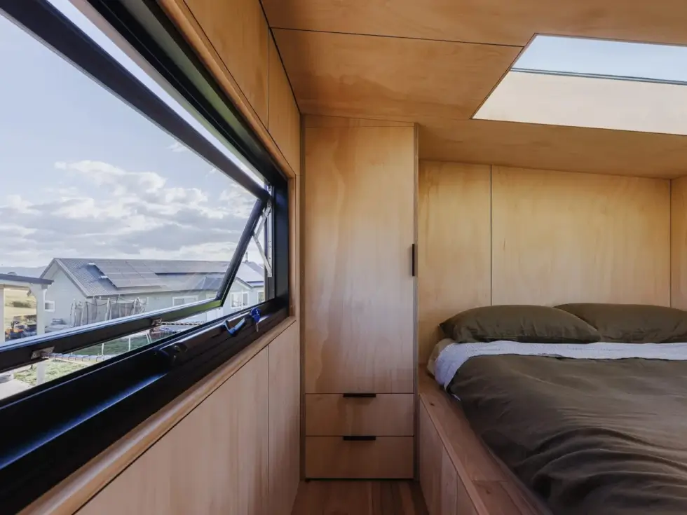 Despite its compact size, the Marrangaroo tiny house hosts two bedrooms placed on opposite ends of the house on the upper level. These are loft bedrooms so there isn’t much headroom but both are equally comfortable. A storage-integrated staircase leads to this area which has a walkway that bridges the two bedrooms. One room boasts a skylight for stargazing but they each offer privacy.
