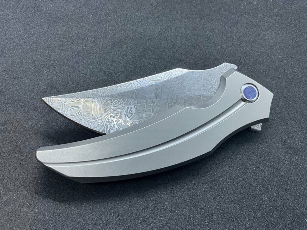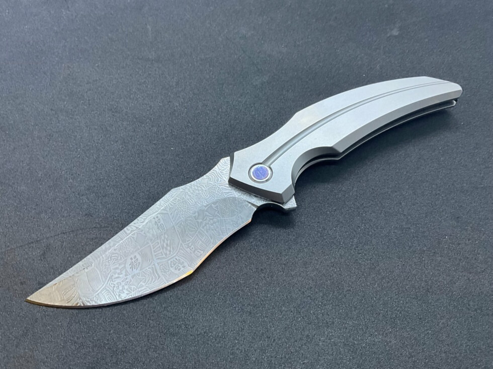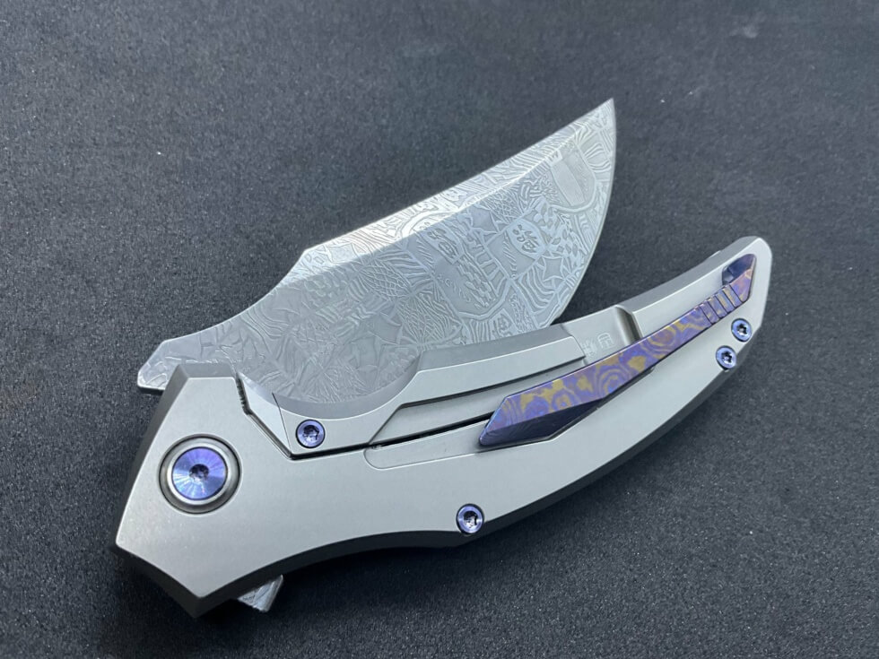 The Rike Knife-S05 boasts eye-catching artistry outside of being highly functional. It’s an original folder crafted in an unusual technical style. It features a sleek and striking silhouette comprising of a gray titanium handle and a mosaic Damascus steel blade boasting an intricate pattern. Then there are the blue anodized screws that only add to the wow factor to this EDC.