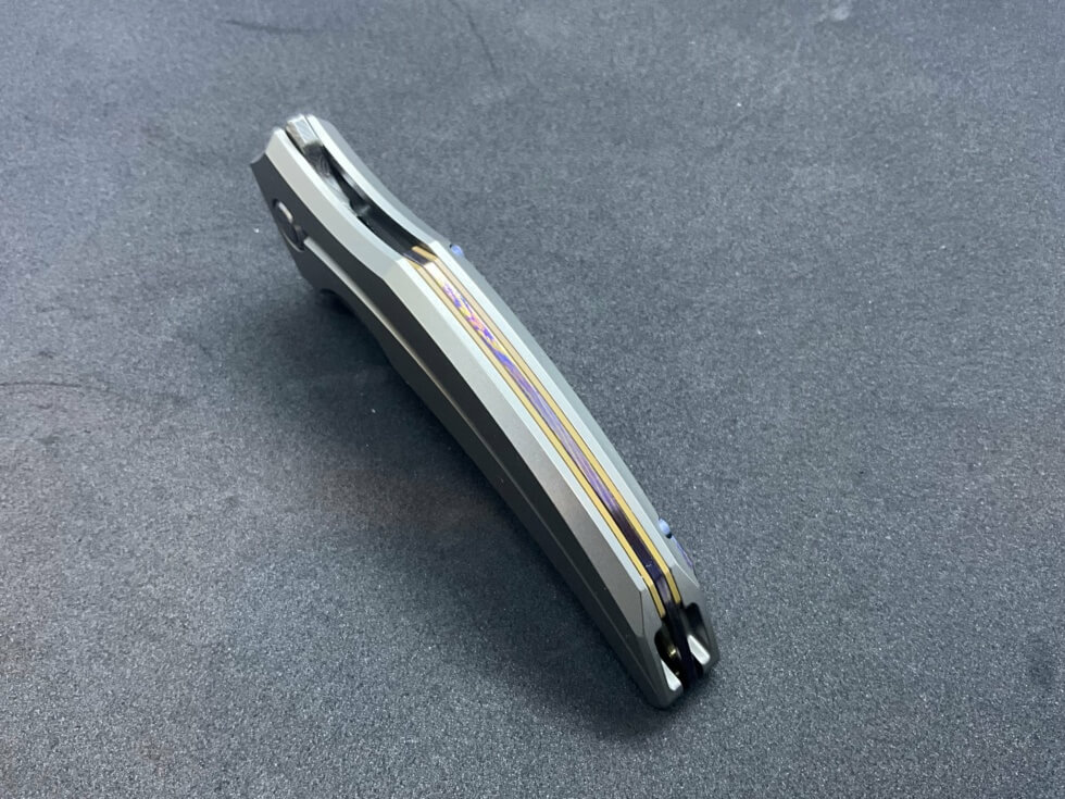 The handle also comes with a back pad made of beautiful bright MokuTi material. The same material is used on the pocket clip, the rear spacer, and the blade of the axis knife. Titanium is known to be strong, durable, lightweight, heat-resistant, physically inert, and resistant to oxidation, thus making it great knife handle material.