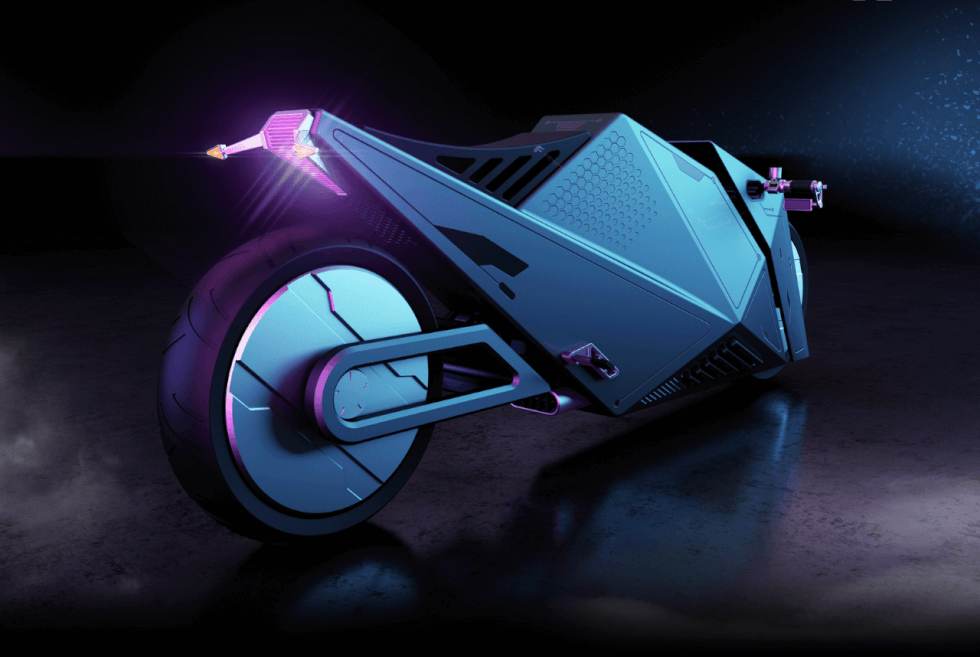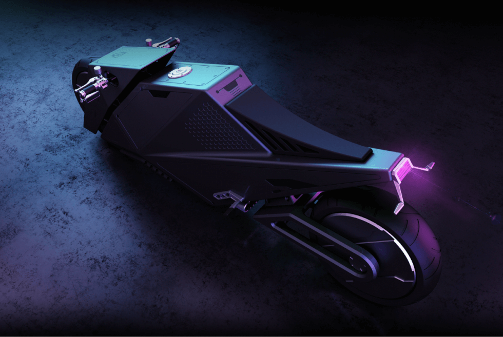What appears to be a metallic fuel tank cap might be a cleverly disguised charging port. Although the images do not show a visible instrument panel, it could be just under the cowl. The front is dominated by a rectangular LED headlight cluster. Meanwhile, the real features a turn signals and a brake light assembly as well. 3D-Mente even shows it beside a concept hypercar with glowing circuitry patterns on its surfaces.