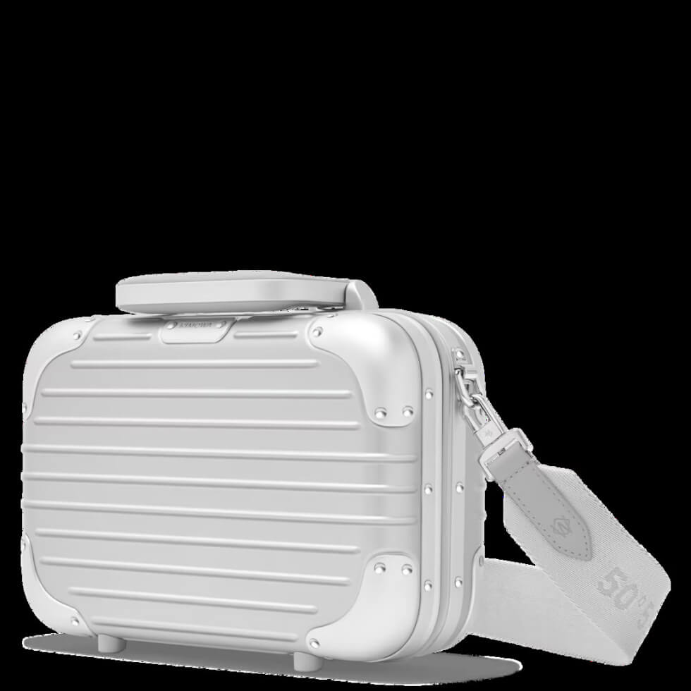 This is a lightweight Cross-Body Bag that is as versatile as it is stylish. It’s a downsized version of the brand’s aluminum suitcases, featuring the iconic grooves and the sleek aluminum shell. It’s crafted from anodized aluminum and features a full-grain Italian leather interior.