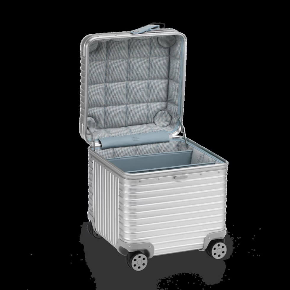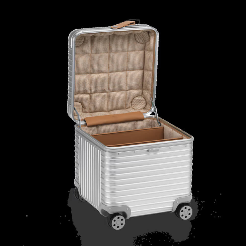 Inside is a generous 59 liter storage capacity with a couple of leather dividers to keep things organized. It can store various items including documents, magazines, bottles, and other personal belongings. Moreover,  RIMOWA equipped the stool with the same high-end multi-wheel system present in their luggage collection. The system offers stable and effortless multi-direction steering thanks to ball-bearing mounted wheels with cushioned axels.