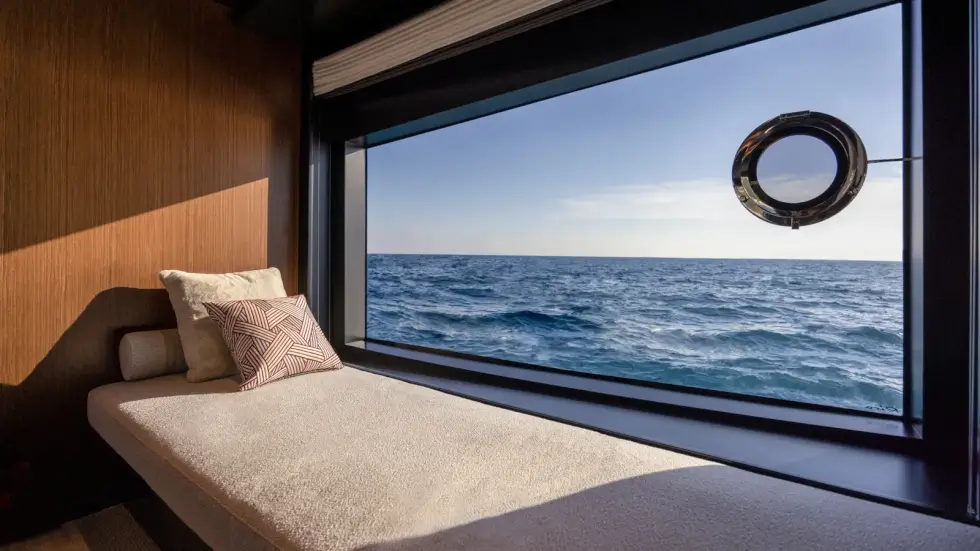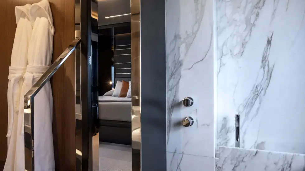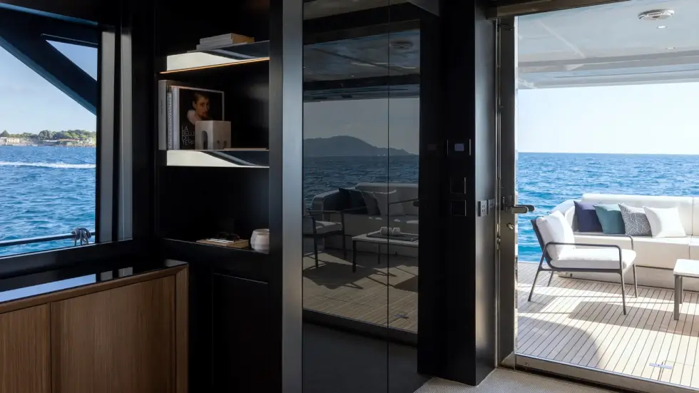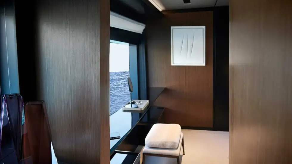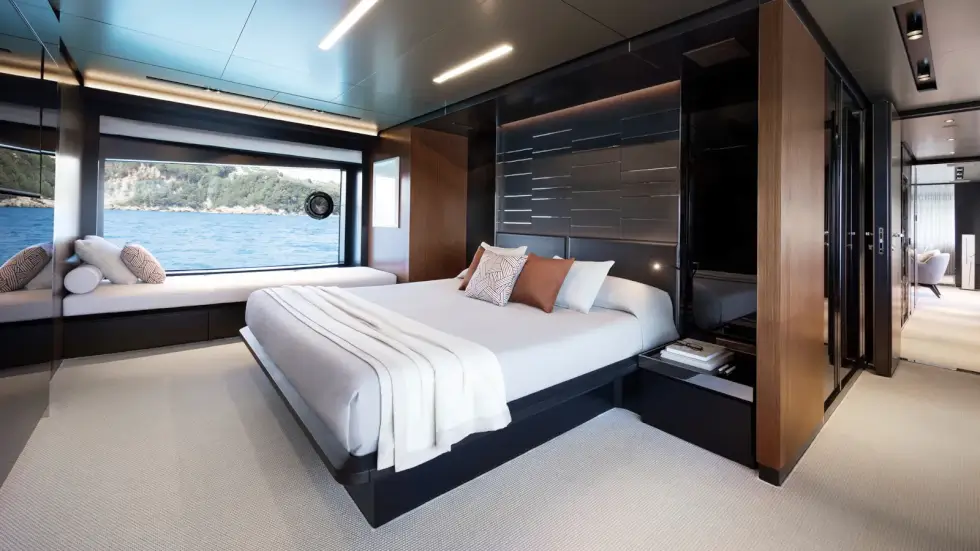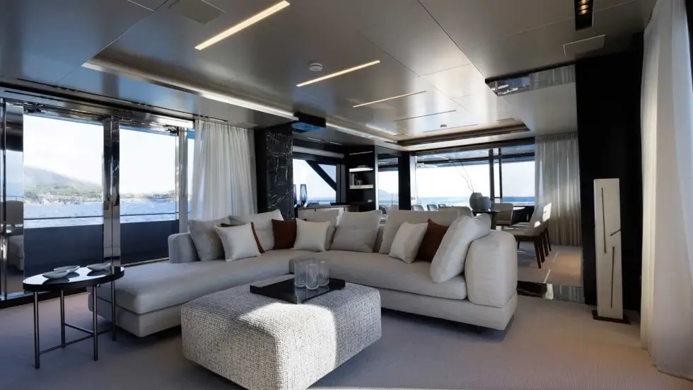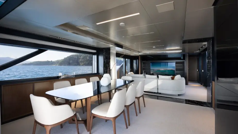 For example, the placements of the living spaces, dining, and accommodations are fully customizable. Opulent materials such as fine wool carpets, Canaletto walnut, and Marquina marble are just some of the available options. Glazing lines almost every inch of the 102 Corsaro Super for outstanding views and natural lighting.