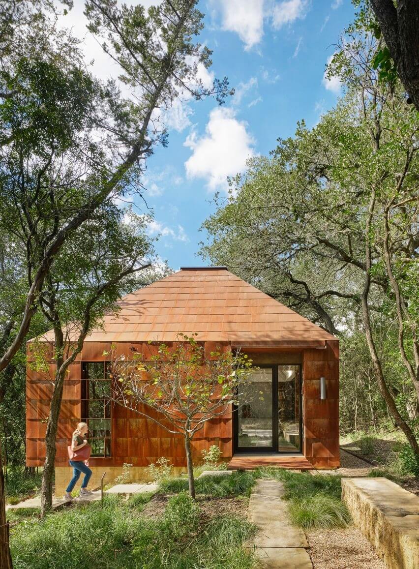Texan Studio Lake Flato Architects clads in weathering steel the River Bend Residence located north of San Antonio, in New Braunfels city, in the Texas Hill Country region. The natural setting of the location, which is known for its German heritage, cultural activities, and two rivers, informed the architectural design.