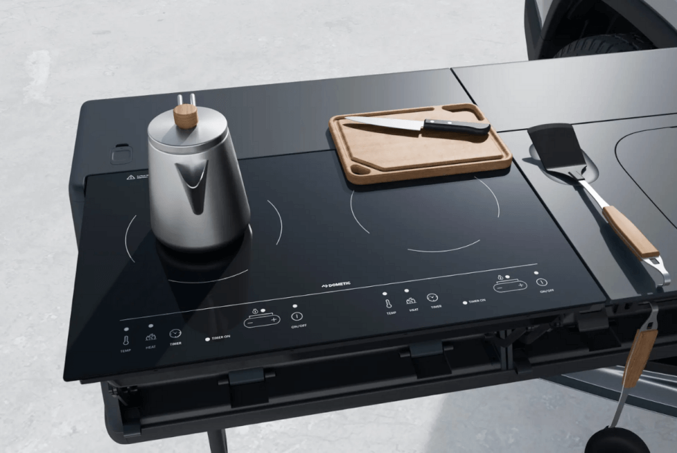 This pull-out module features a two-burner induction cooktop. No flames mean even heavy winds won’t be a problem. There’s a collapsible sink, spray faucet, and a 4-gallon water tank. You also get slide-out shelves to store the 30-piece kitchenware set provided by Snow Peak.