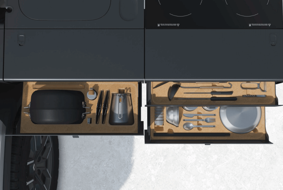 As you can see, EVs are gradually becoming even more mainstream and will eventually make combustion engines obsolete. Among the two models, the R1T has more upgrades for its Adventure Gear system. First up, there is the Rivian Camp Kitchen x Snow Peak.