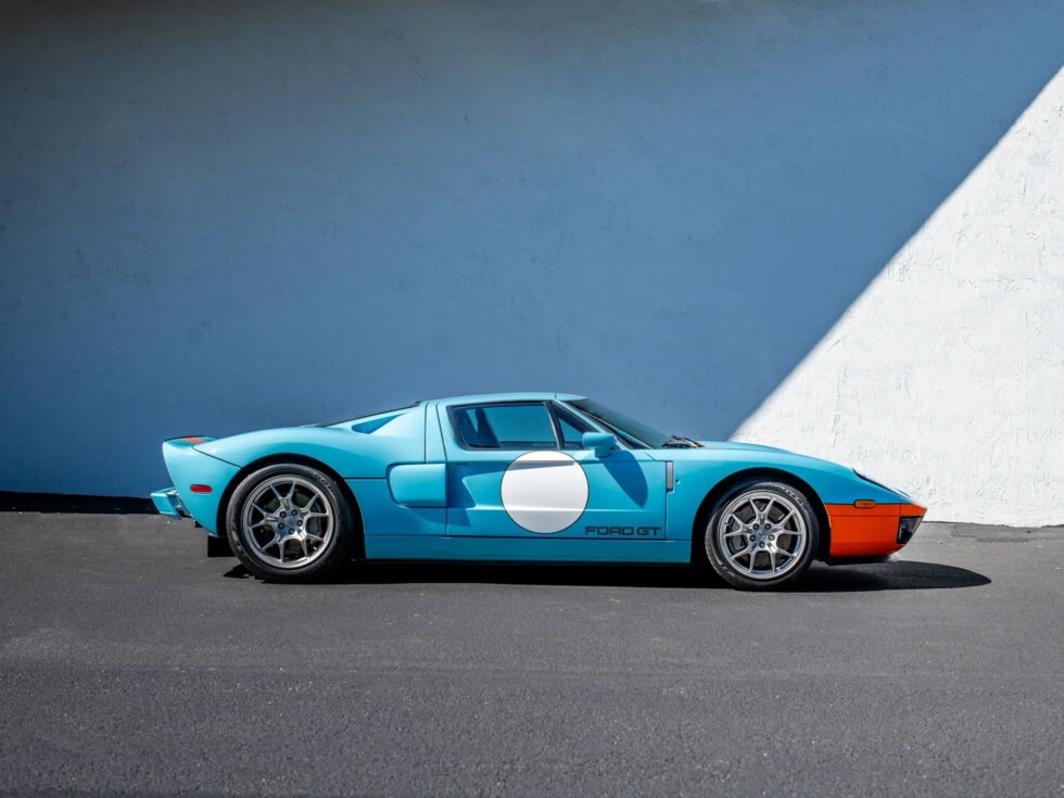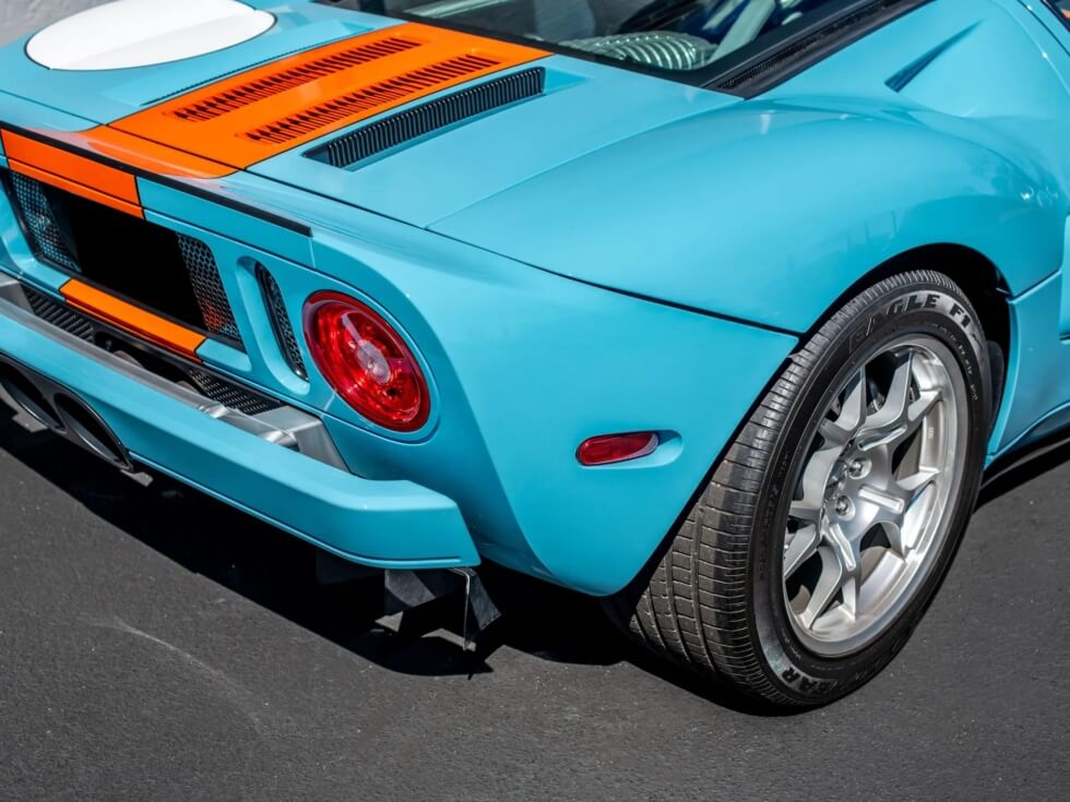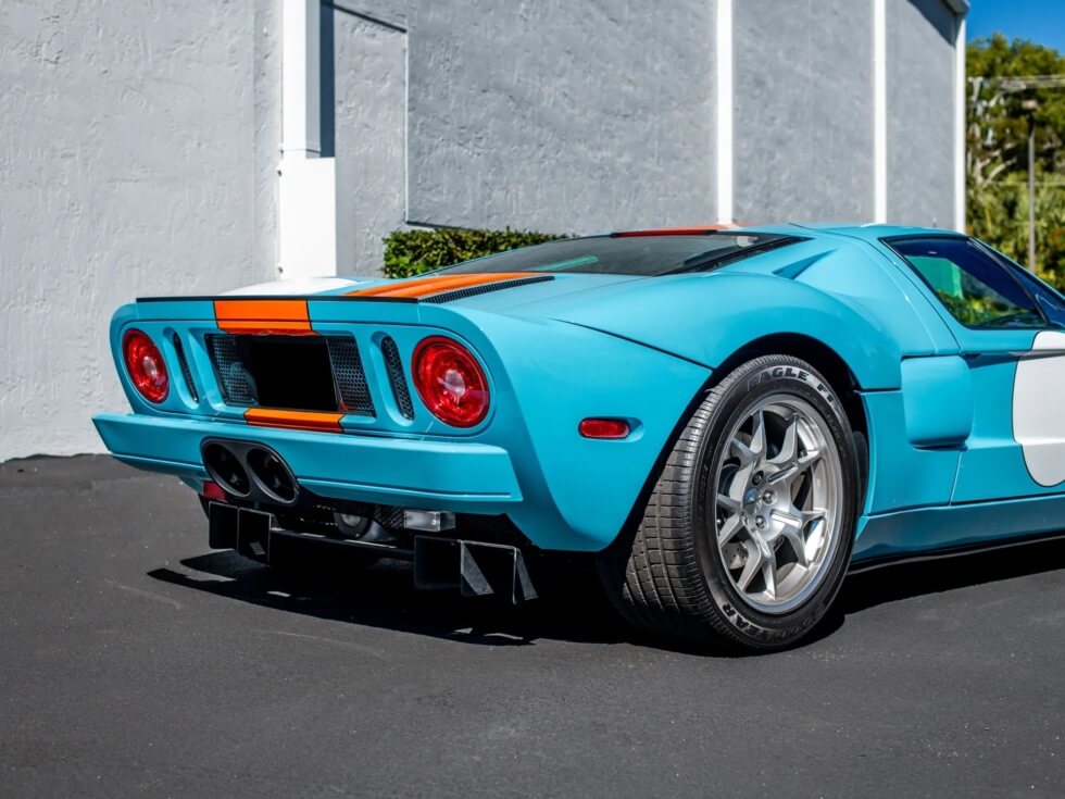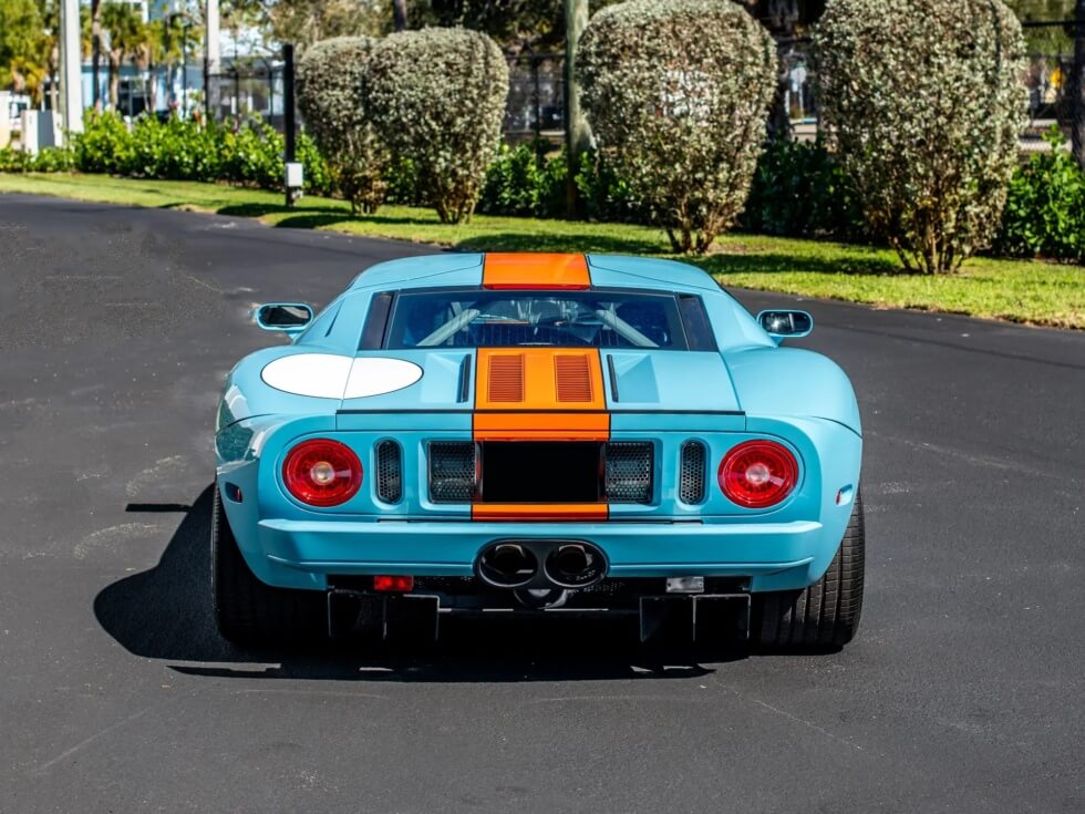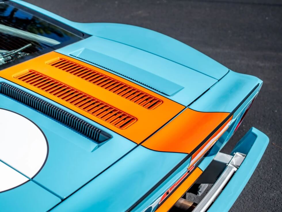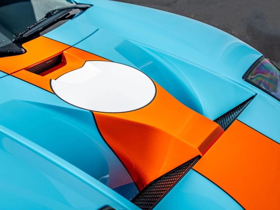 Furthermore, the exterior paint job pays tribute to the John Wyer Gulf Oil race car design. The listing indicates the official color codes as “Heritage Blue with Epic Orange GT stripes with four white roundels.”