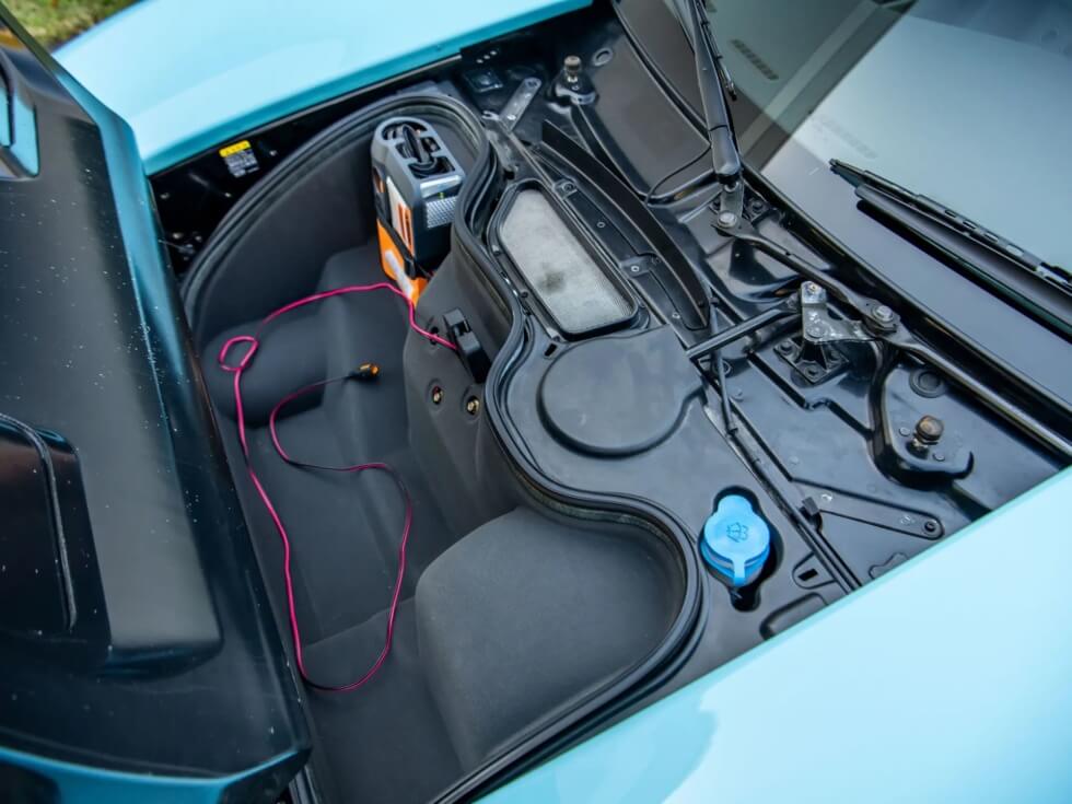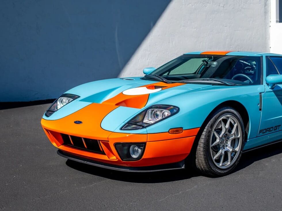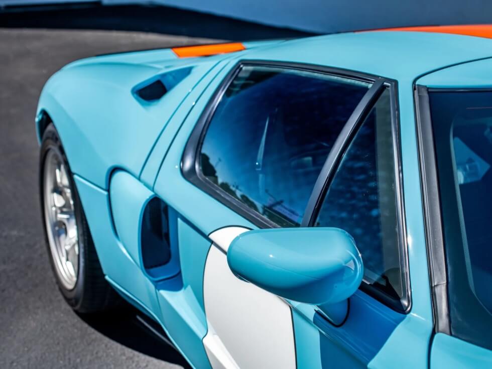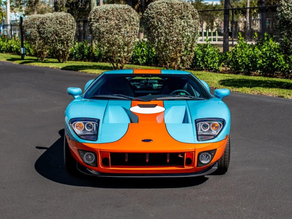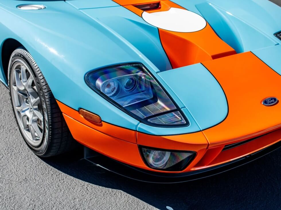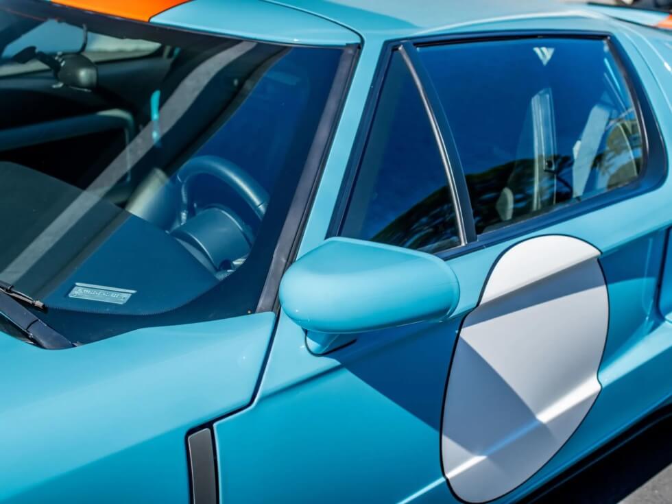 Furthermore, the exterior paint job pays tribute to the John Wyer Gulf Oil race car design. The listing indicates the official color codes as “Heritage Blue with Epic Orange GT stripes with four white roundels.”