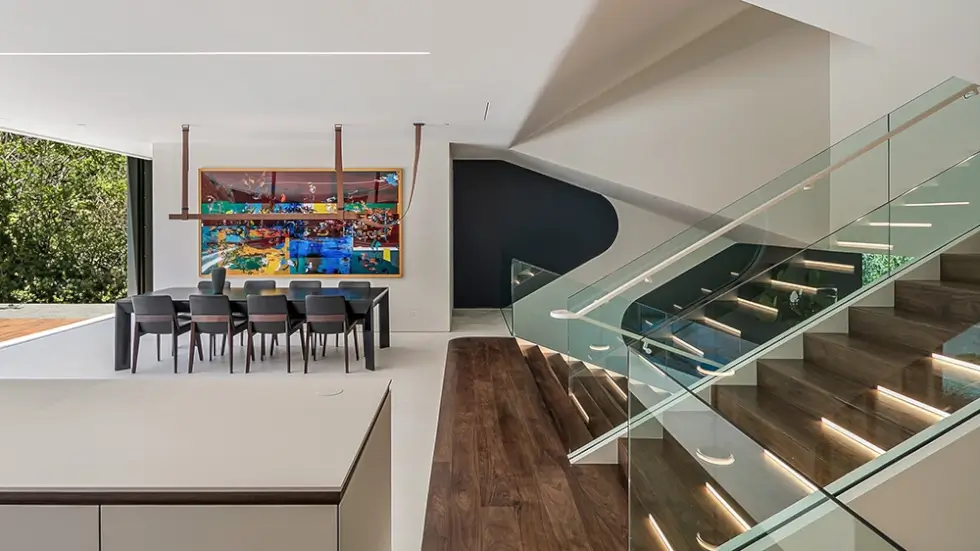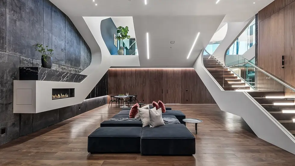 The luxurious Roberto Lane Manse in Los Angeles, California is CNC-milled from a digital design. It mirrors the design of sleek hypercars with its sinuous lines and swathes of glass. The design resembles the Pininfarina Battista or Mercedes-AMG One.