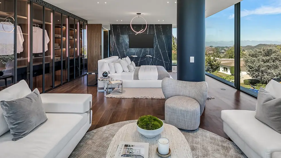 The lower level of the Roberto Lane Manse has a living room with a fireplace and high ceilings. There’s also a formal dining room, a family room, and a guest bedroom or office with an en suite bath. There is also a luxury kitchen and a wraparound balcony accessible via the sunroom that offers views from the Getty to the Pacific Ocean.