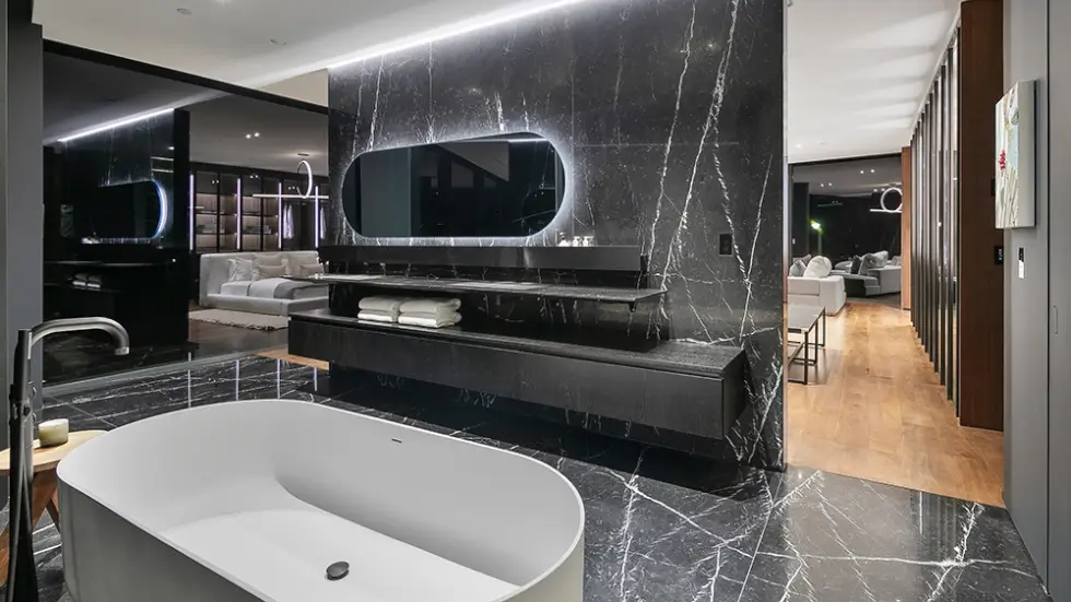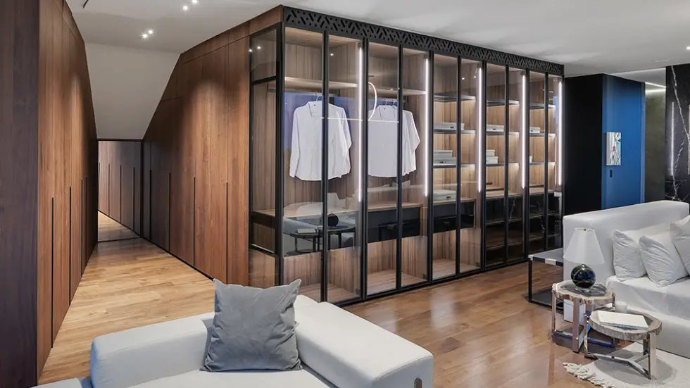 Meanwhile, the upper level offers a spacious primary bedroom with glass closets equipped with integral lighting, amber doors, and a separate sitting room. Nero Marquina marble slab walls and flooring with matching Agape sinks and faucet adorn the en suite primary bathroom. There are two additional beds and baths on the upper floor. They have their own glass closets and separate private en suite baths with Graff luxury fixtures, wall-hung Catalano toilets, and imported Spanish tile work.
