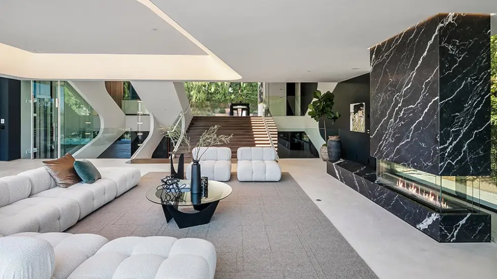This Bel Air property sits on 10, 316 sq. ft of land and boasts a split-level design with four bedrooms and five bathrooms. From the outside, a 16ft cantilever on the second floor serves as the entrance canopy. Then as you venture inside, you will see an open-plan layout with heavy use of glass. The open floor plan of the Roberto Lane Manse is perfect for interior design personalization.
