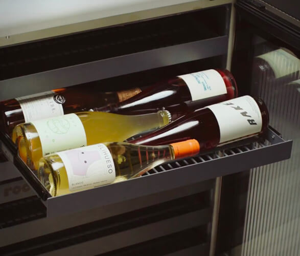 The Rocco Super Smart Fridge offers temperature digital controls in-app and on the fridge with a range between 37°F and 64° F. Likewise, dimmable lights controlled in-app illuminate the drink collection and frameless, triple-layer UV reeded glass helps diffuse light for improved insulation.