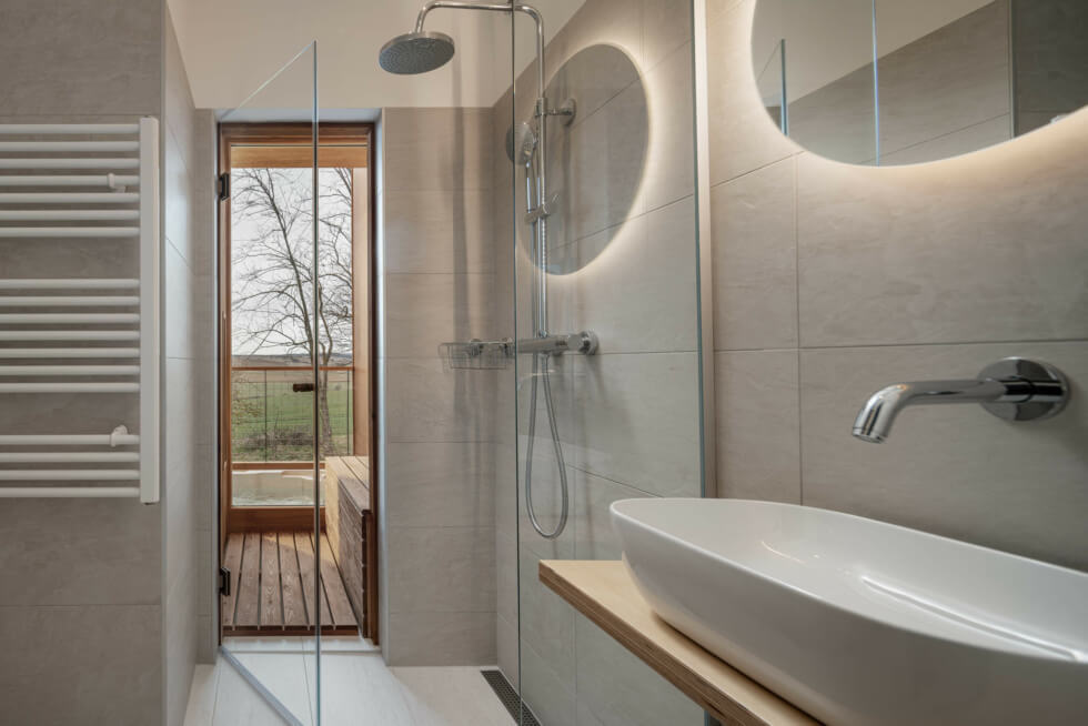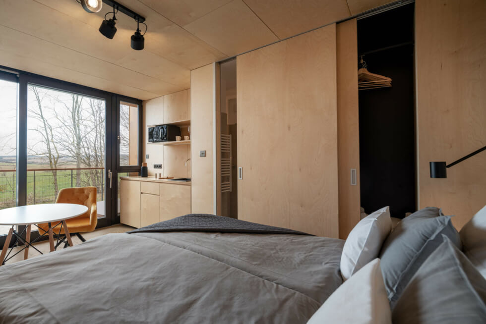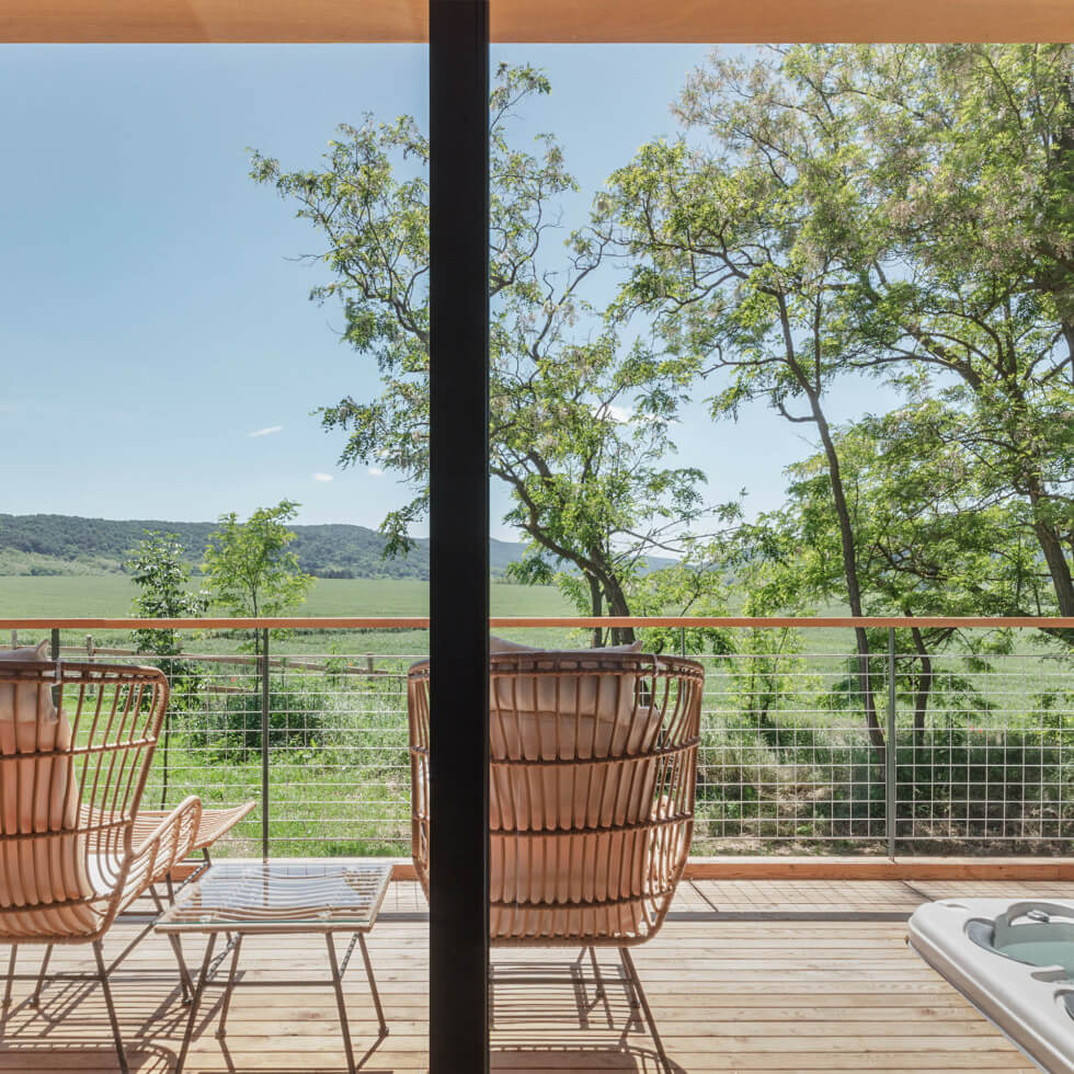 Sliding floor-to-ceiling glass windows make the volume feel open as natural lighting filters through by day. The Rock Cabins also have spacious covered terraces with two seats and a coffee table. Here you can just sit back, sip your beverage, and admire the serene landscape. A hot tub occupies a corner with direct access to the shower and infrared sauna.