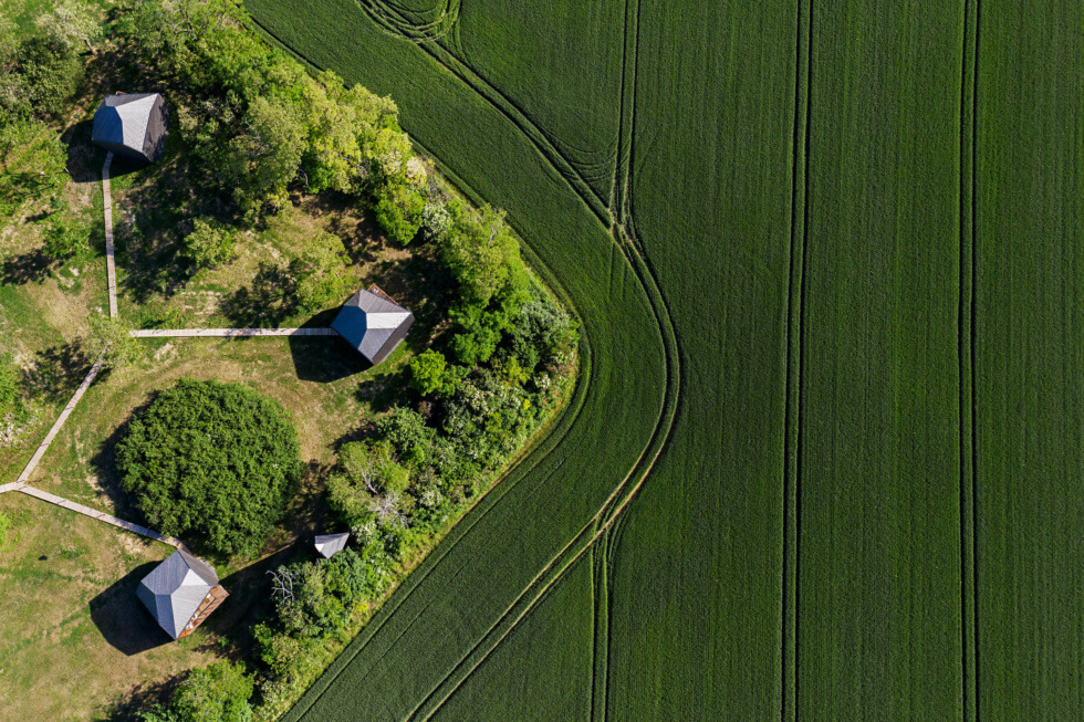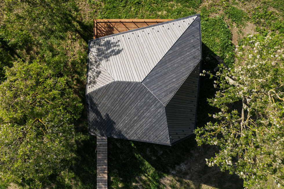 Rather than using concrete, the studio is opting for dark gray timber panels for the exterior surfaces. The contrasting patterns from the cladding resemble cut and polished sedimentary rocks. Hello Wood also counts on TreeHouses to help draft the blueprints. These stand on Csóromfölde, which was previously a farmstead.