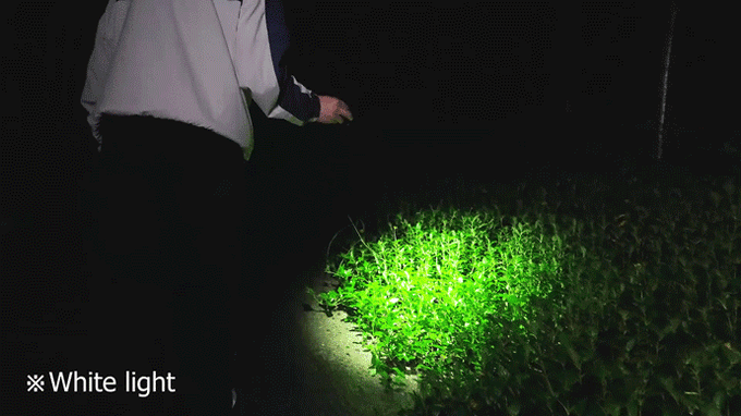 It has UV, red, and blue light, white and warm white light, a warning signal, and even a green laser. A slide of the switch lets you choose the light mode and it has memory function for user convenience. The white light has four brightness levels with a max of 1500 lumens and ECO at 20 lumens, plus a strobe.