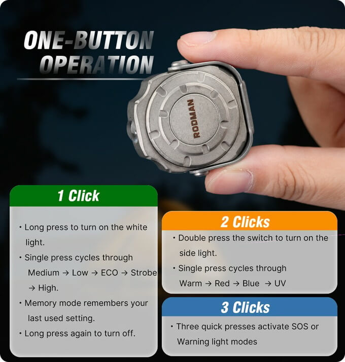 Rodman’s ED08 flashlight runs on a USB-C rechargeable 150mAh battery, which offers approximately 45 minutes of continuous use at maximum brightness. It is good for up to 26 hours in low-light mode. Meanwhile, its one-button operation ensures a user-friendly experience every time.