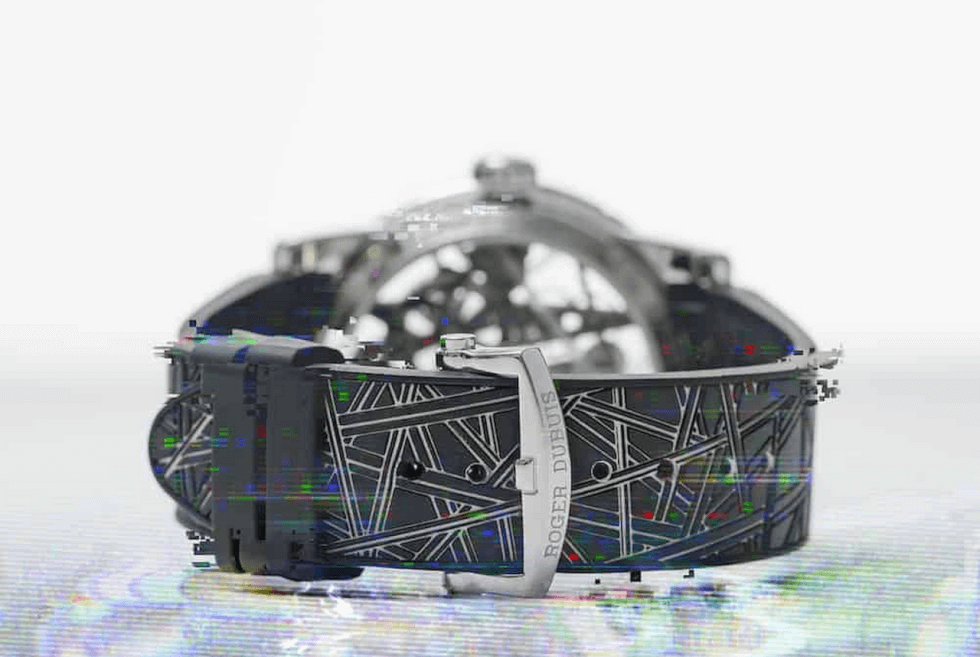 Within beats Roger Dubuis’ self-winding RD820SQ movement in clear view under the sapphire crystal. The skeleton dial showcases mesmerizing mechanisms of its 167 components which are all meticulously hand-finished. This calibre takes 530 hours to complete and boasts a 60-hour power reserve. However, a timepiece this luxurious will likely always stay on your wrist all the time.
