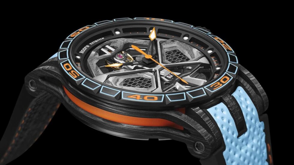Instead of going all out, Roger Dubuis is still keeping black as the dominant shade. The 45-mm case is carbon with a titanium bezel in black PVD coating. You can spot hints of orange on the caseband, crown, and minute markers on the bezel. A light blue outline highlights the edges, which gives the Excalibur Huracán STO a stylish look.
