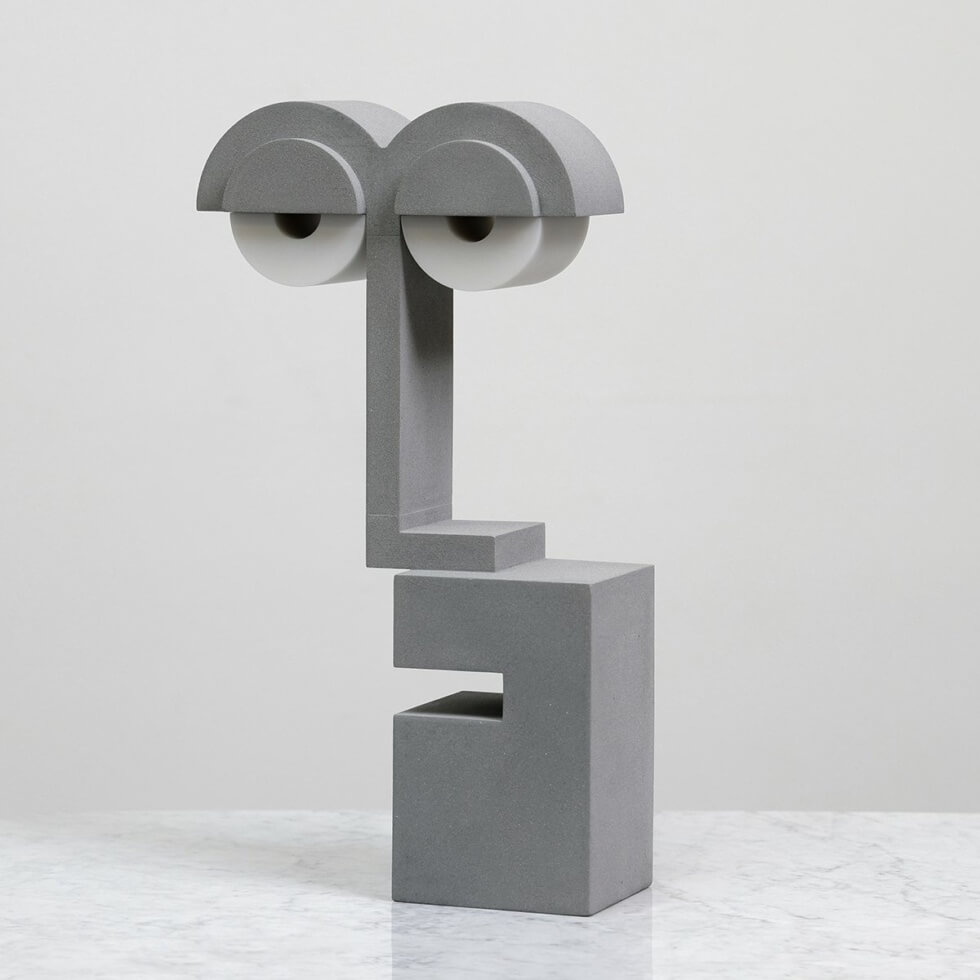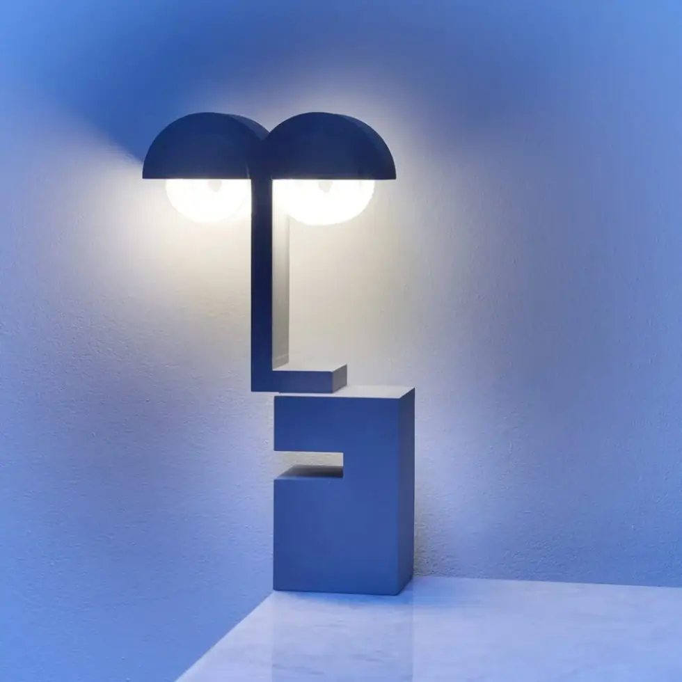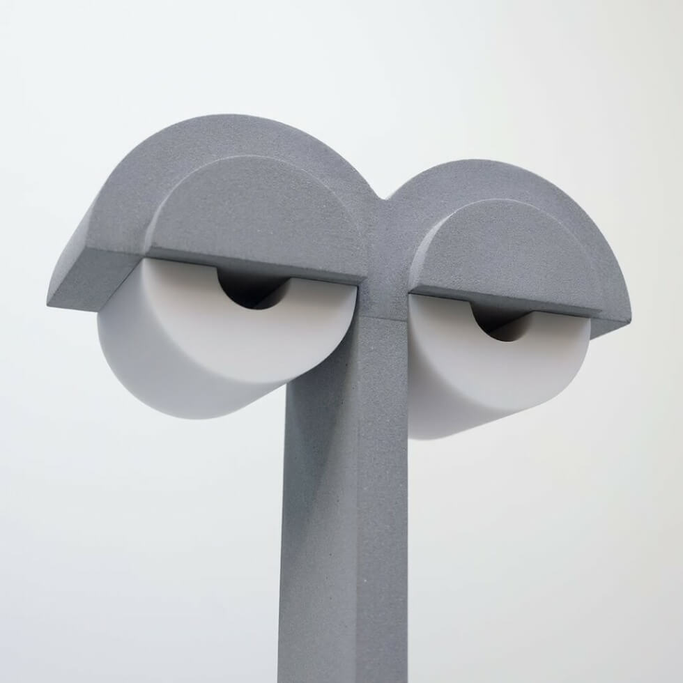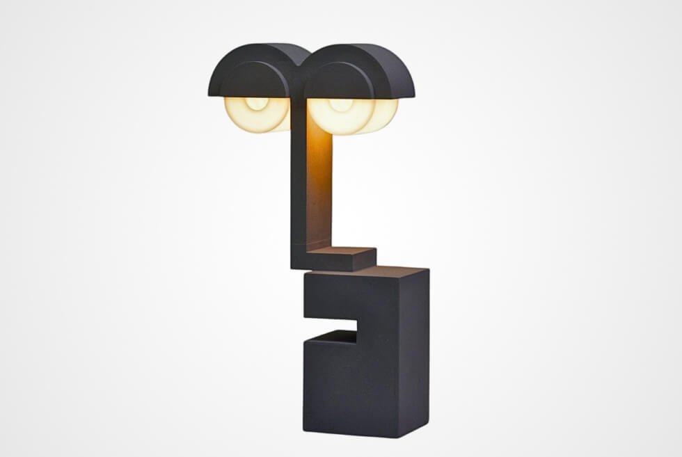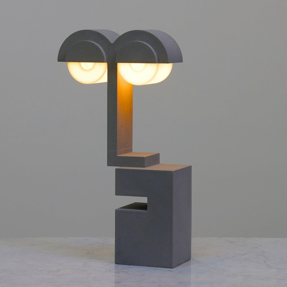 The severity gives the inanimate object more attitude than character. One that presents a dry, understated humor that contrasts the lamp’s minimalist and rigid geometry.