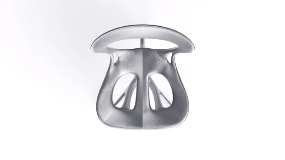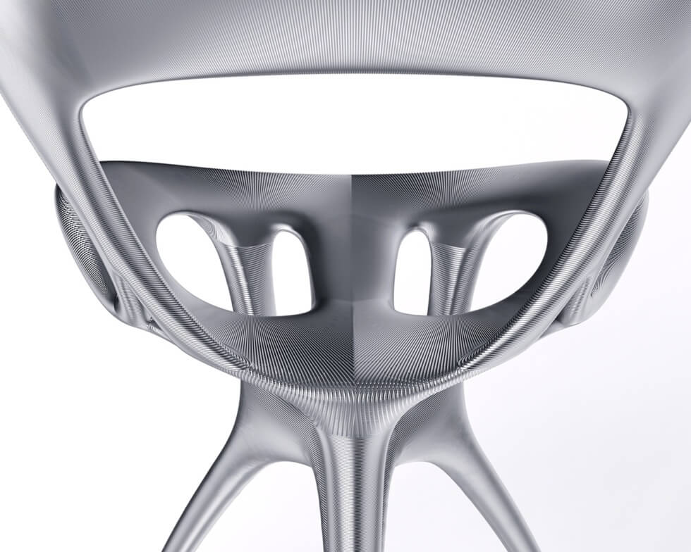 The result features continuous curves and organic transitions between the chair’s parts. It boasts a fururistic silhouette that blends fluidity and structural integrity. But it took mental efforts to achieve the specific design.