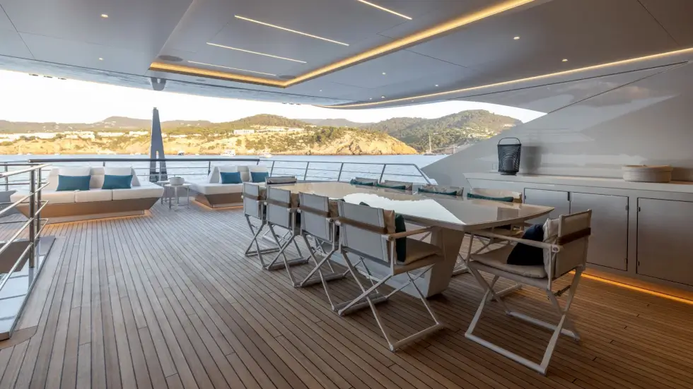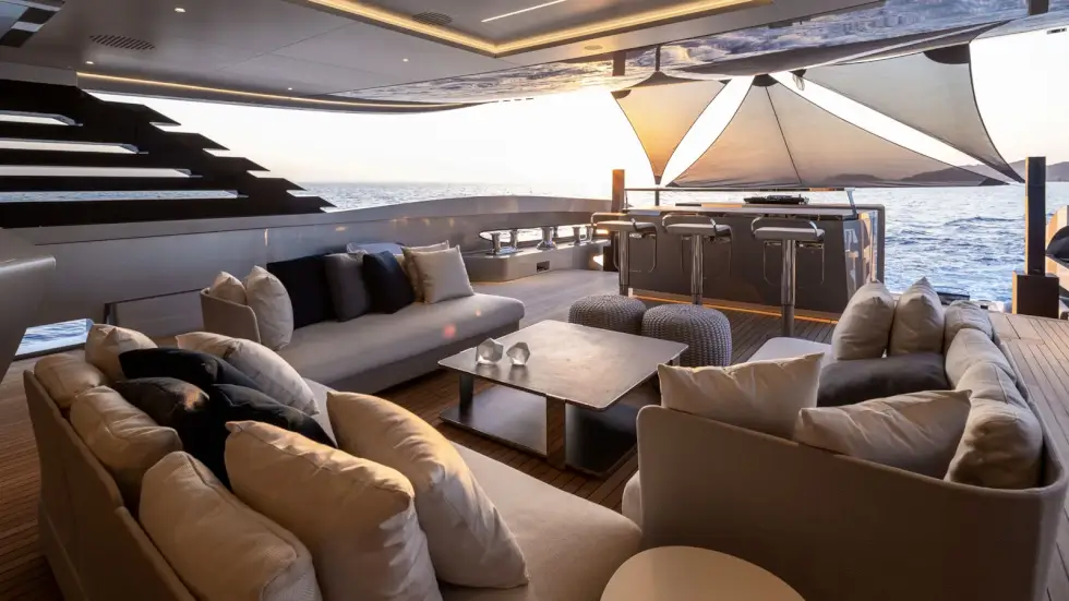 The 30-foot-wide beam translates to larger spaces inside and outside the No Stress Two. Take the aft beach club wherein the transom flips open and turns into a social space with various forms of recreation and entertainment. In addition to its electric propulsion, a diesel generator is also available when the situation calls for it.