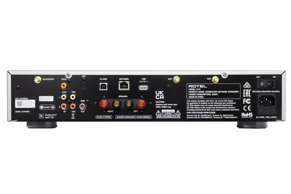 Rotel engineers the amplifier to deliver up to “150 Watts of Class AB power.” A color display shows the album artwork and other details about your tunes. These include track, title information, and more. The S14 is Roon-ready with support for MQA and MQA Studio for streaming high-fidelity audio.