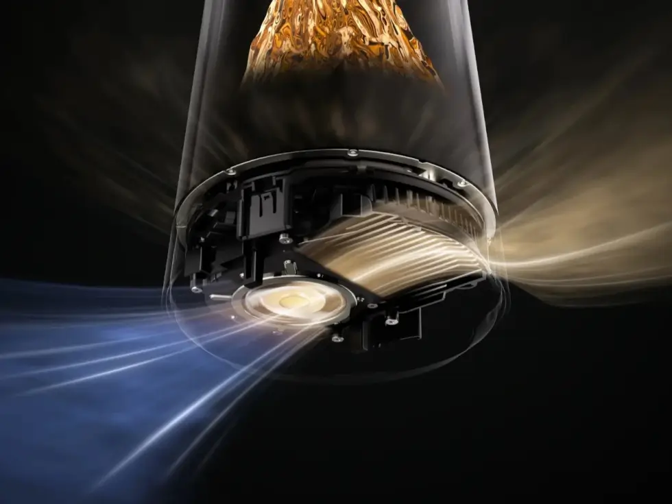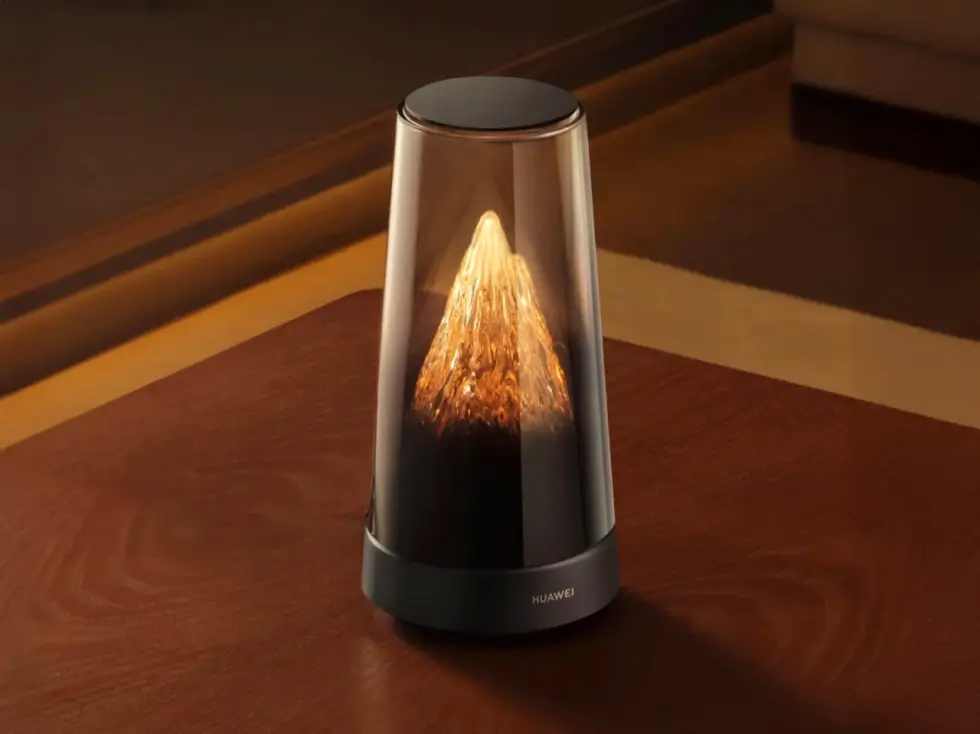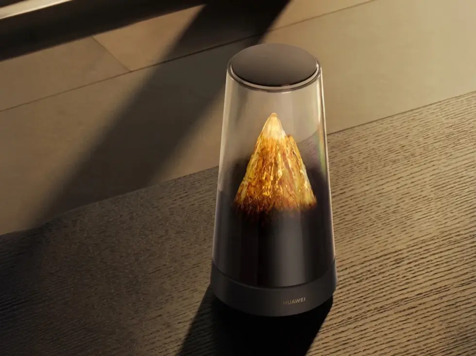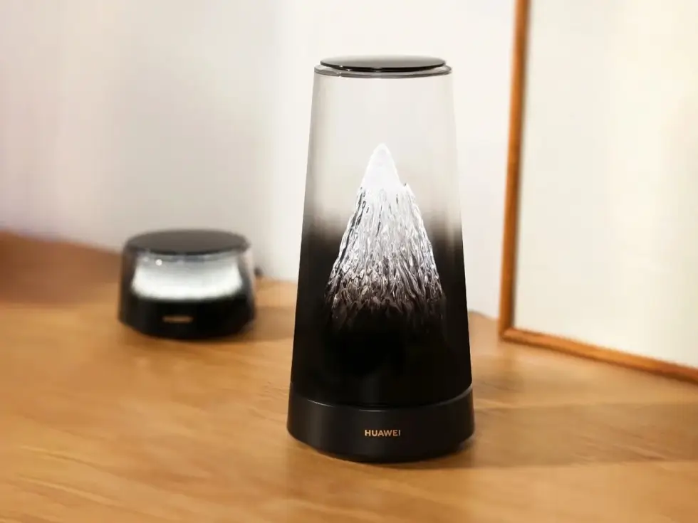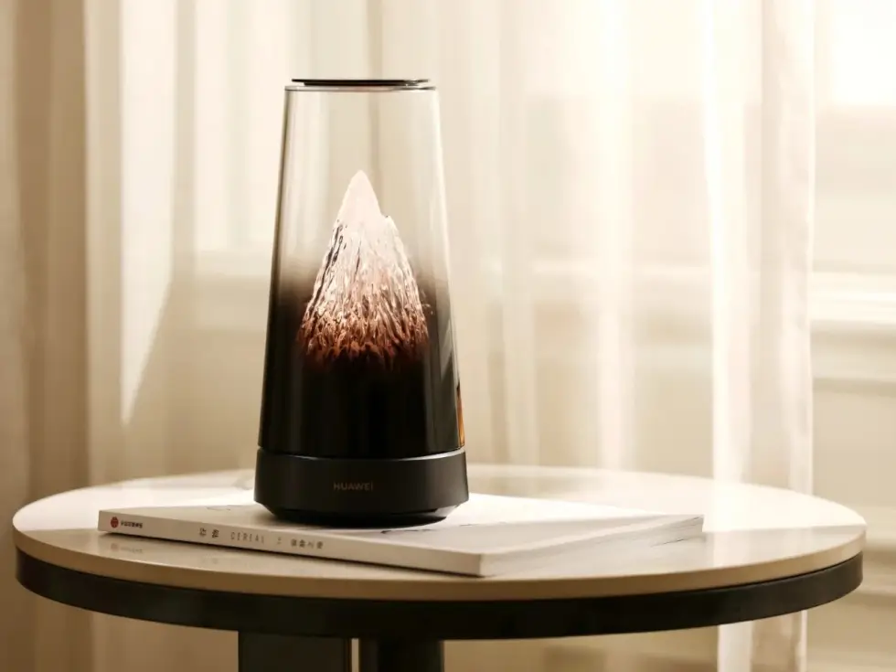 It somewhat reminds us of futuristic smart speakers with a bit of retro charm courtesy of transparent elements. This networking device touts a cylindrical form factor that gently tapers toward the top. Instead of exposing the circuitry and components, the transparent tube has a gradient shade to fully cover the bottom yet expose the crystalline mountain with a golden glow as your gaze moves upward.