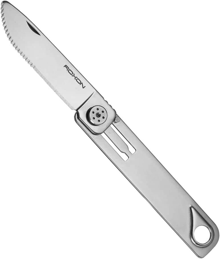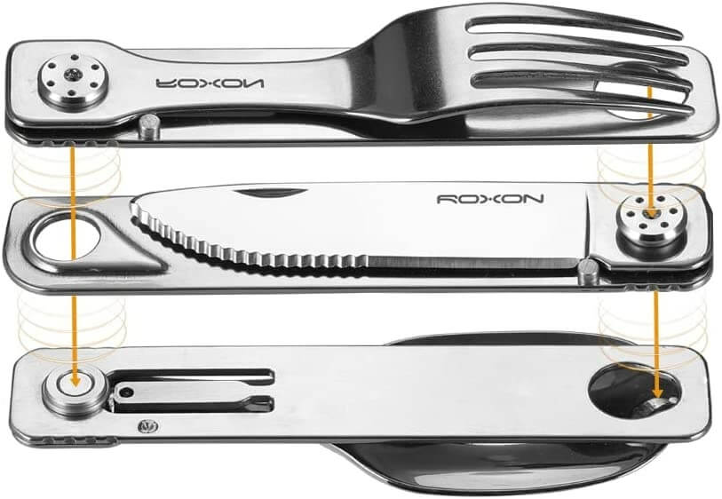 The utensils in the ROXON C1 Camping Cutlery fold to half their size so you can easily squeeze them in your pocket, bag, or lunch boxes. When it’s time to eat, simply unfold them to their full size and built-in magnets securely lock them in place. The knife is even strong and sharp enough to cut into steaks or vegetables.
