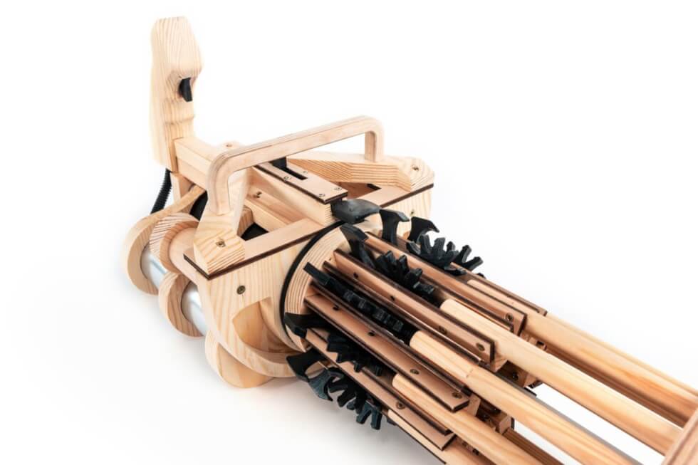 The manufacturer crafts the Rubber Band Minigun out of wood, which makes it lightweight and thus portable. There are two types available for order as well as two colourways. Buyers who want to start shooting straight out of the box can go for the Assembled version. Meanwhile, those who want to build it from the ground up can grab the KIT variant. Other than the assembly required for the latter, both are practically the same. Prepare to unleash fury with a press of the trigger as the motorised barrels destroy targets up to 30 feet away.