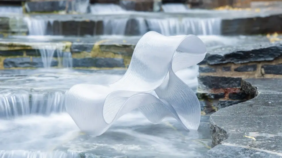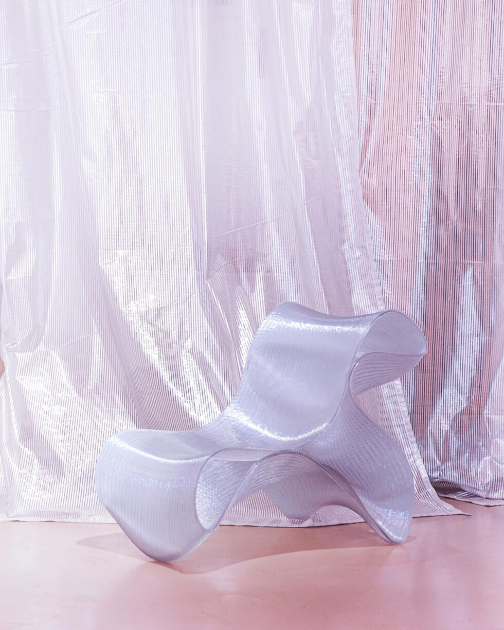 German architecture studio Mungenast / Morroni 3D-printed the Ruffini Chair out of recycled plastic bottles, formed based on double-curved surfaces. This method allows minimal use of material but renders a durable and sturdy furniture. It gives the chair structural integrity to carry heavy loads despite its wall thickness of just 8mm.