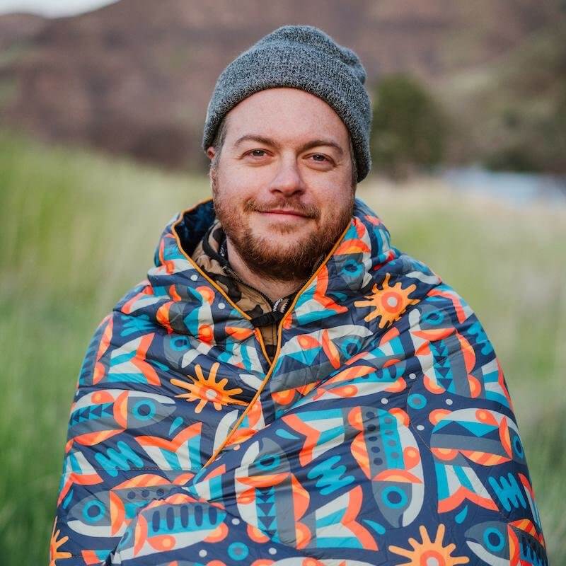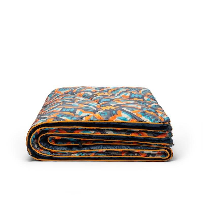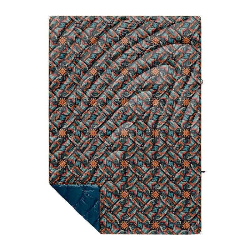 A warm blanket is always a great companion when in the great outdoors, especially while camping out. It gives comfort during chilly conditions and also makes for a great seating option. The Rumpl x Brett Stenson Fish Are Fly Puffy Blanket, for one, offers both.