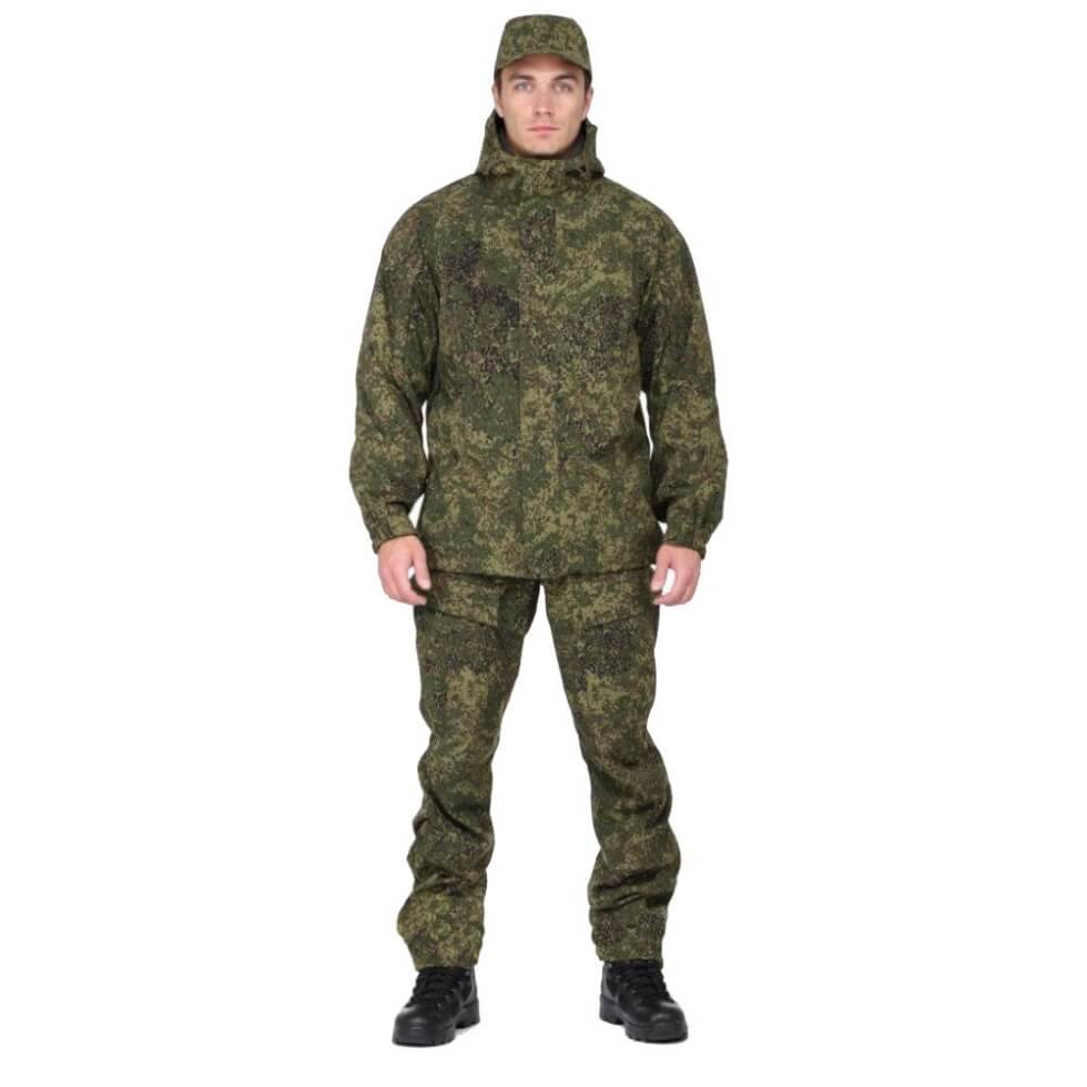 Russian Cold Camo suggests that buyers start out with this set that includes a pair of pants, a windbreaker, and a cap. This is the Russian military’s main field dress for cold weather. It boasts high steam penetrability, improved water-resistance, and is quick-drying. It is made of 99% polyamide with 1% elastane.