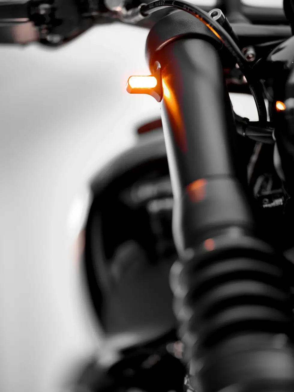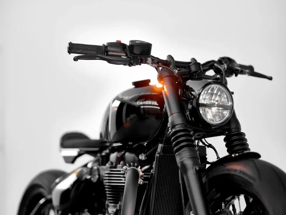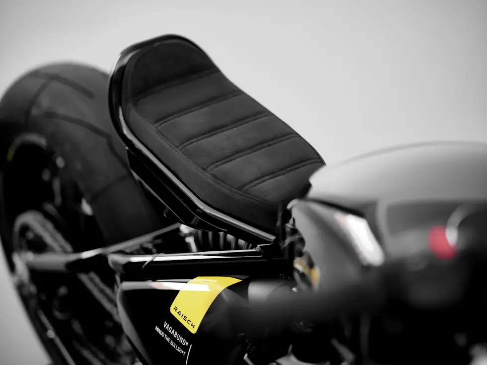 Vagabund Moto proudly points out the custom subframe with its ShinYo stripe LED taillight/indicator combo. The saddle is upholstered in Alcantara for a hint of luxurious comfort. The RXV Bobber sports black anodized fork covers with integrated Raisch LED turn signals.