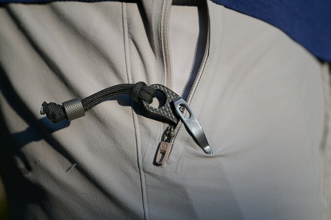 Meanwhile, the ergonomically-shaped carbon fiber handle includes a grip tape and jimping for enhanced grip comfort and control. It also has a finger guard for protection and an oversized lanyard hole for a paracord and a pocket clip.