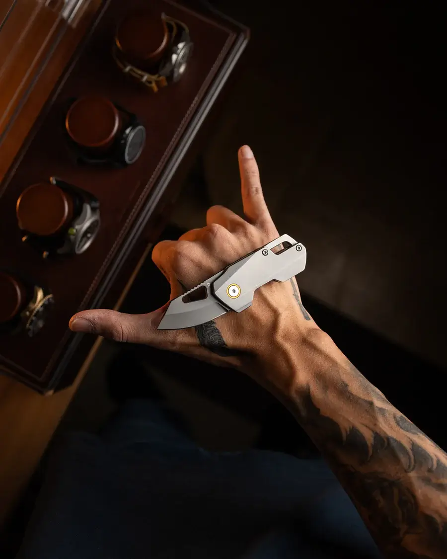 This folder is milled from Grade 5 titanium and measures 2.4″ when closed and 4.1″ when fully opened. It’s a lightweight EDC at just 60 grams but packs a sharp clip point blade deployable via a thumb flip and a frame lock for safety during use. It’s a fidget friendly microblade designed for everyday adventures and even has scales in the brand’s signature geometric design language.