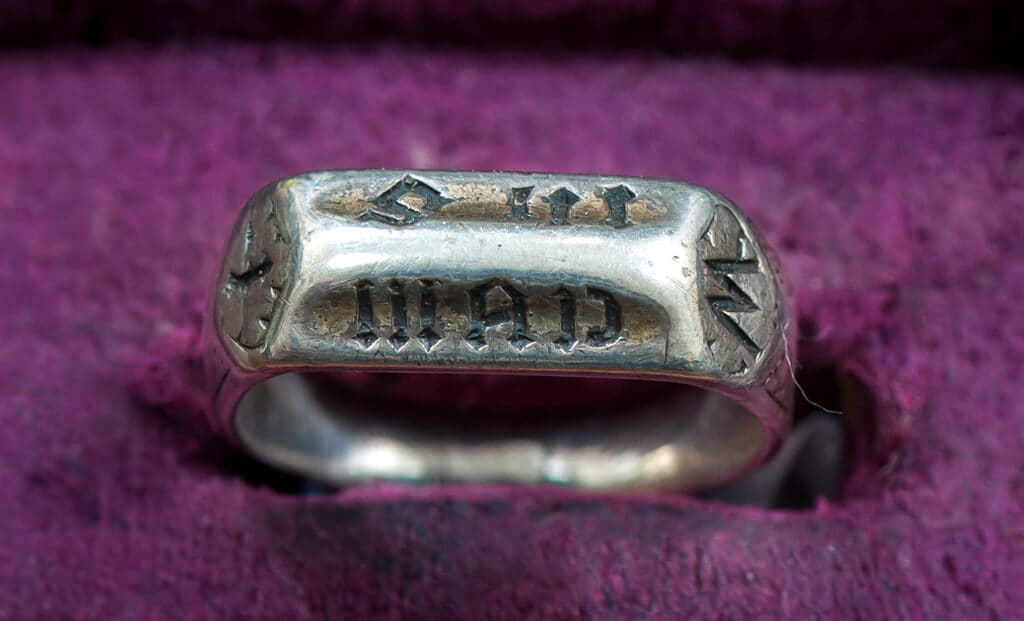The ring was sold by TimeLine Auctions at a Bloomsbury event in London. It came in an oak casket and it as sold with extensive documentation, including research notes, articles, BBC features and exhibition catalogues. Before being offered at auction, the silver-gilt artifact had been part of museum exhibitions both in England and in France.